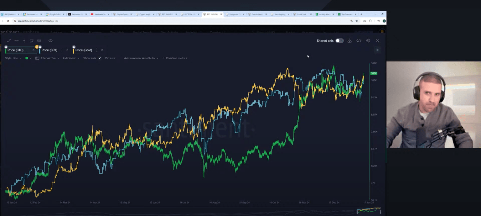 Brian examined the correlation between crypto, equities (S&P 500), and gold. He pointed out that while crypto and the S&P are currently moving in tandem, the most significant bull markets occur when this correlation is minimal. He further suggests that the market may experience a retrace in the S&P 500, which could potentially impact crypto, but that strong institutional investment in crypto could see it climb without support from stock markets. Despite the strong correlation seen throughout 2023 and 2024, he urges traders to be cautious.