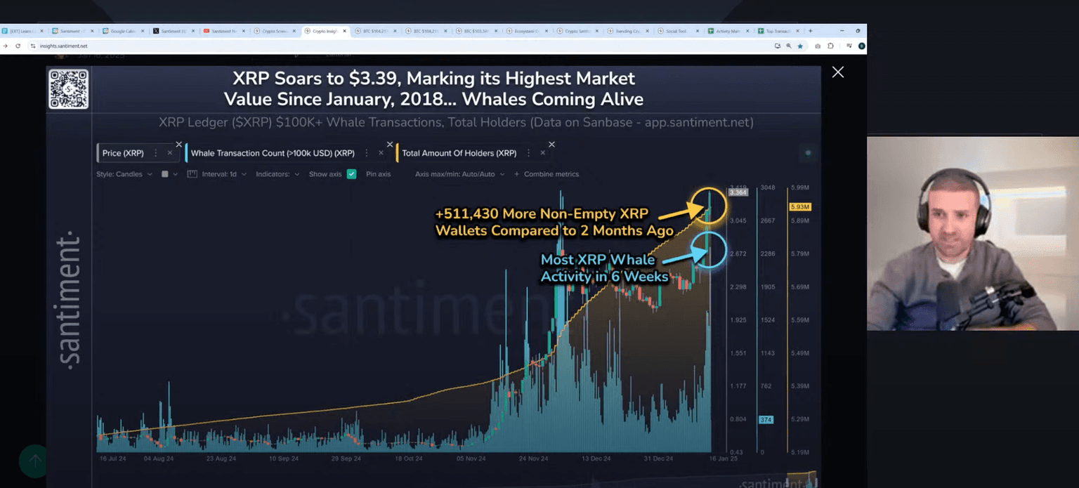 Brian then shifted to an analysis of social media trends, noting that Bitcoinโs social volume has slightly decreased, while Ethereum saw a 12% increase in mentions. XRP, in particular, has seen a massive increase, with social media discussions more than doubling compared to the previous week. XRPโs surge is becoming a central focus, drawing significant attention across the market, whether or not you are invested. This increased attention is a key factor for traders to take note of as it could be a sign of further volatility.
