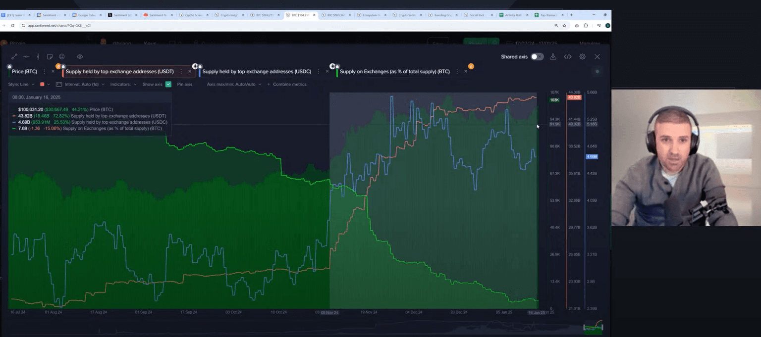The discussion shifted to supply on exchanges, with Brian noting that Bitcoin supply on exchanges has decreased to 7.69%. This means that key stakeholders are moving coins off of exchanges into cold wallets, which is a positive indicator that suggests no imminent sell-off. On the other hand, the amount of Tether and USD Coin held on exchanges has increased, especially after Trump's election, indicating a readiness for potential buying opportunities. This combination of data points to positive bullish momentum for crypto.