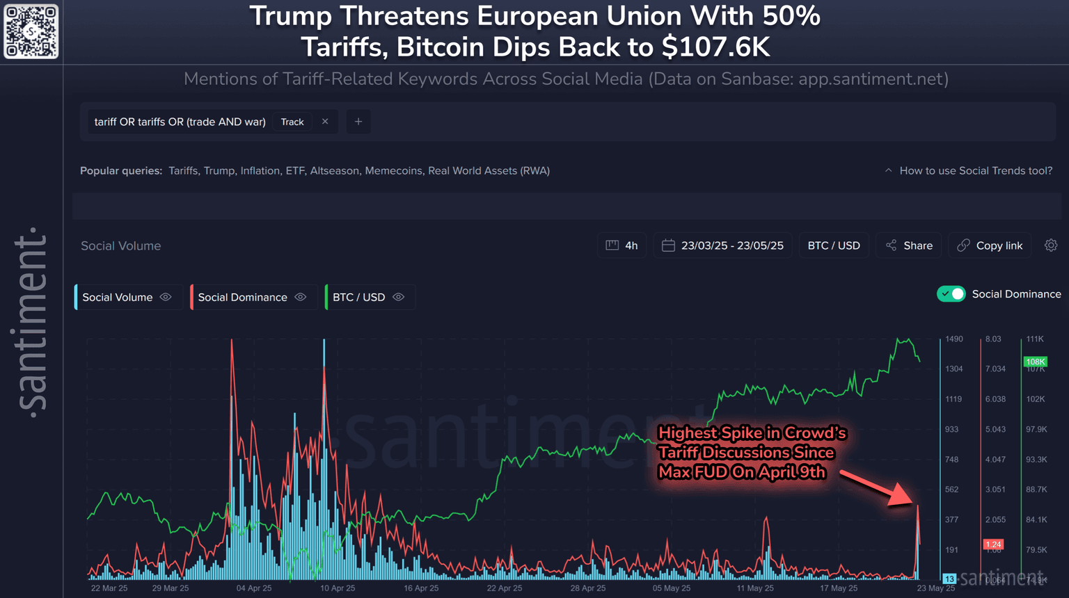 Less than 2 weeks after a cloud appeared to be lifted between the boiling trade war involving the U.S. and China, this new wrinkle has brought back the highest level of tariff discussions since the peak FUD across crypto markets from April 7th to 9th.