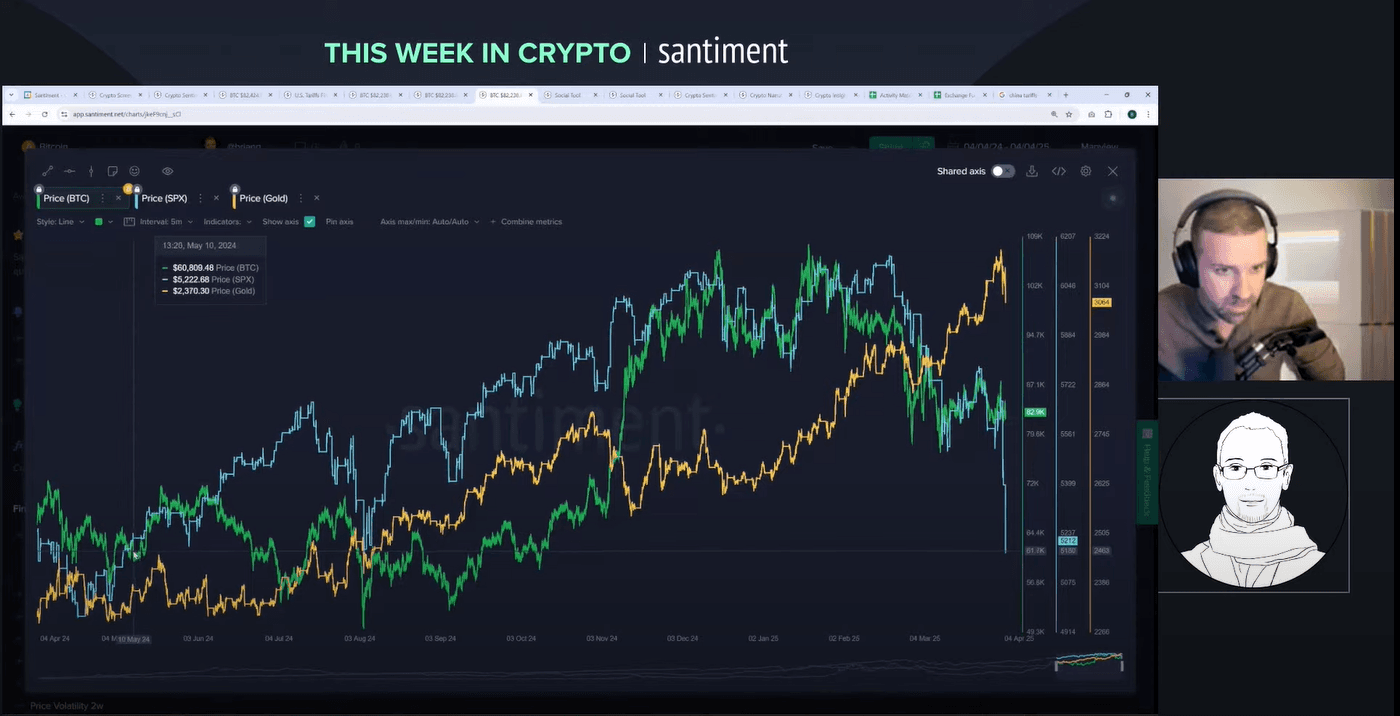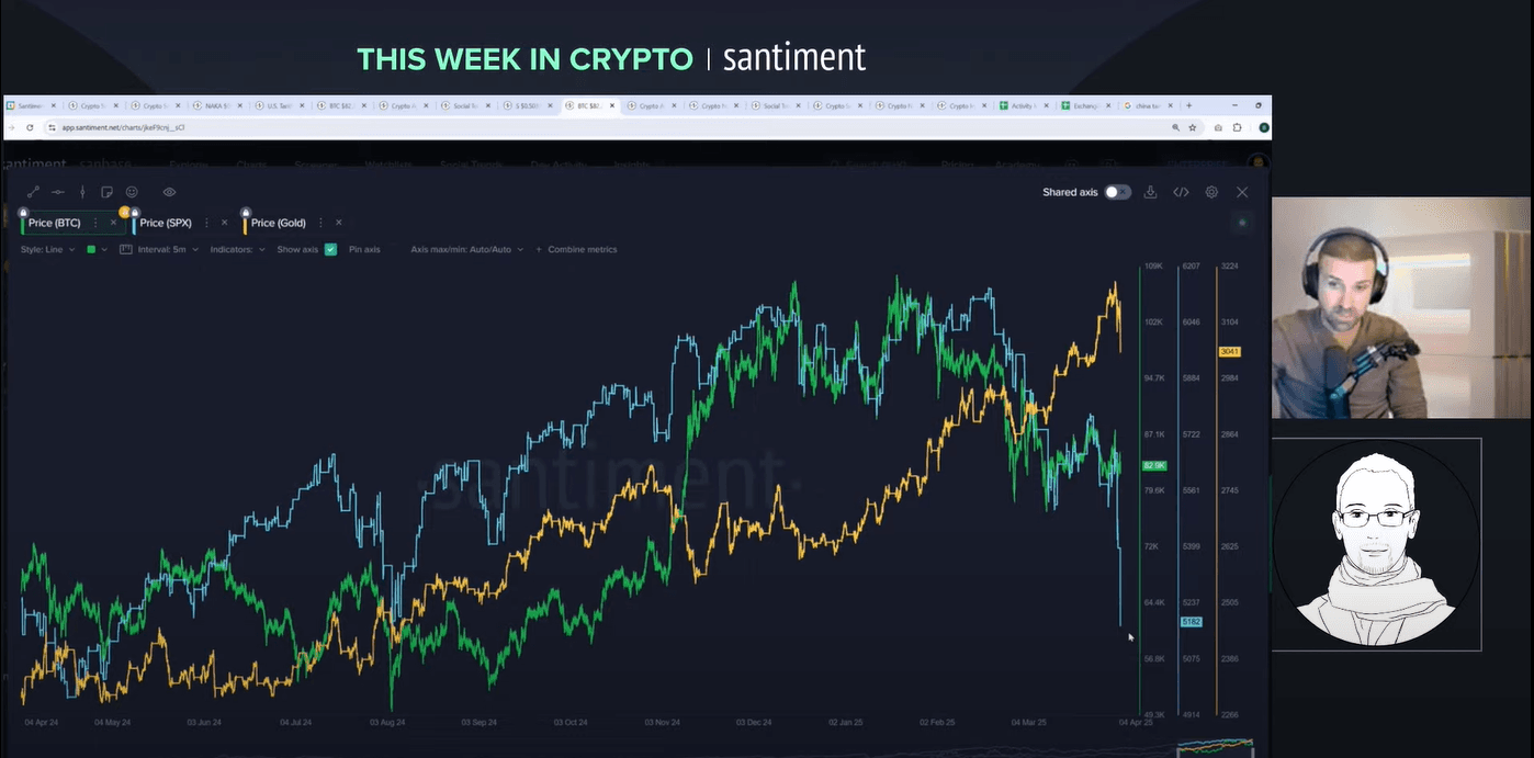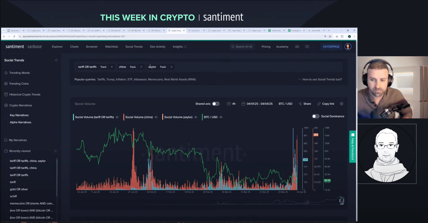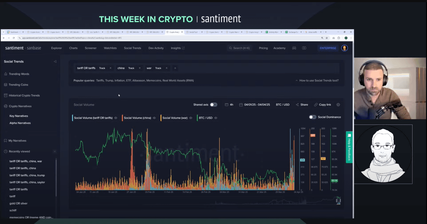 Welcome to a wild week in crypto! On 4 April 2025, Brian and Maksim tackle a livestream packed with insights on tariffs, market crashes and the surprising strength of crypto. Brian, Director of Marketing, brings years of market analysis to the table. Maksim, CEO of Santiment, adds a global perspective on sentiment and trends. Why listen to them? They combine hard data with real-time reactions to unpack chaos like the S&P 500's 10% plunge and China's 34% tariff retaliation. Want to know how bitcoin holds up while stocks bleed? Or why the whales are moving? Let's break it down.