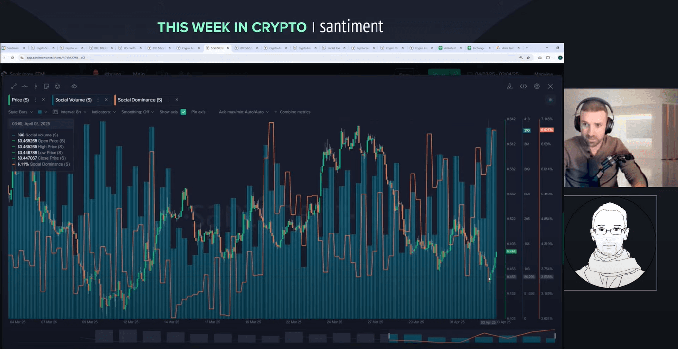 Sonic grabs attention. Social dominance hits 6.9%âbig for a #53 altcoin. Brian ties it to an 8% bounce. Itâs on the radar, he says. No top yet. Altcoin fans should watch.