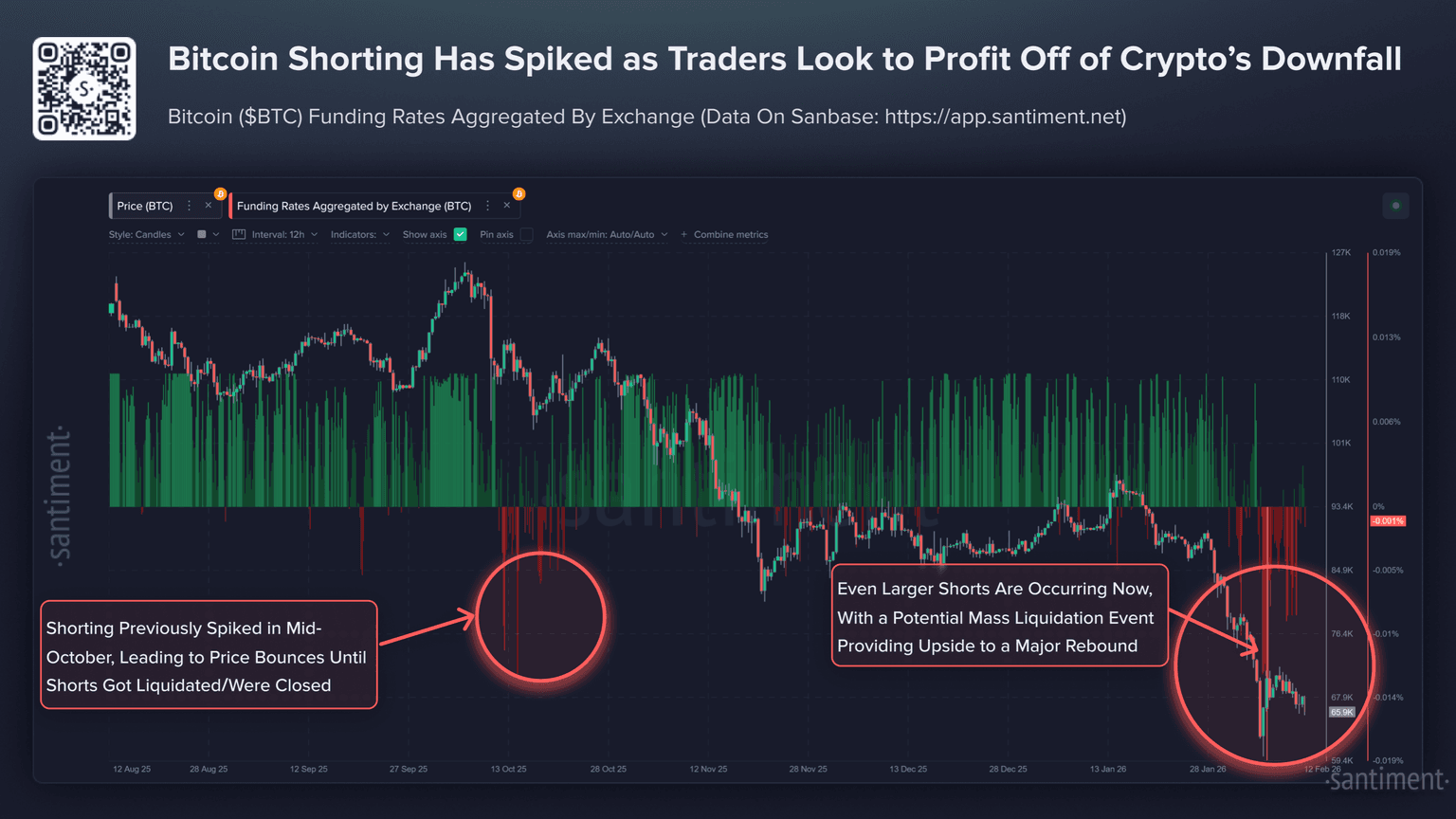 π€― BREAKING: According to aggregated funding rate data across crypto exchanges, this latest wave of short positioning is the most extreme seen since August 2024, a period that marked a major bottom for Bitcoin. At that time, funding rates also fell deep into negative territory as traders aggressively bet on further downside. Instead, the market reversed. The liquidations of overcrowded short positions helped ignite a powerful recovery, with Bitcoin climbing roughly +83% over the following four months. When crypto traders talk about funding rates, they are referring to a mechanism used in perpetual futures markets to keep contract prices close to spot prices. A funding rate is a small fee that traders pay each other at regular intervals. If the rate is negative, short sellers are paying long traders. If it is positive, longs are paying shorts. When aggregated exchange funding rates fall deep into negative territory, it signals that a large portion of the market is heavily positioned for downside (reflecting FUD).