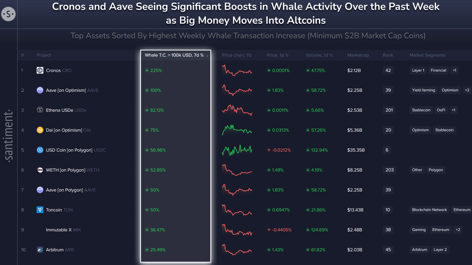 π Keep an eye on the following crypto projects seeing major boosts in whale transactions in the past week (compared to their whale activity the prior week):