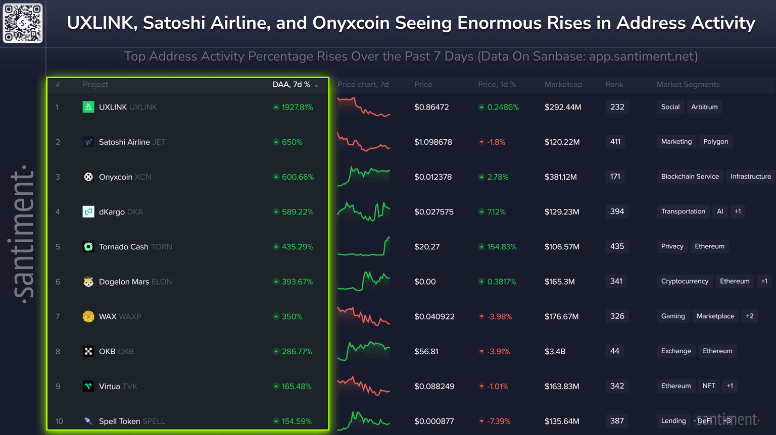 π Which cryptocurrencies are seeing the biggest increases in overall wallet activity this week? Among $100M+ assets, here are the top 10: π 1) UXLINK $UXLINK