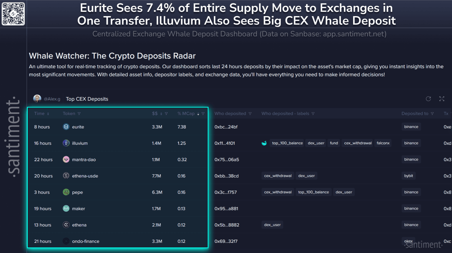 π³ With altcoins skyrocketing this week, there are some major whale transfers moving to centralized exchanges. Eurite had a $3.3M transfer 8 hours ago, which makes up 7.4% of its supply. Other big whale moves include Illuvium, Mantra, Ethena, & Pepe.