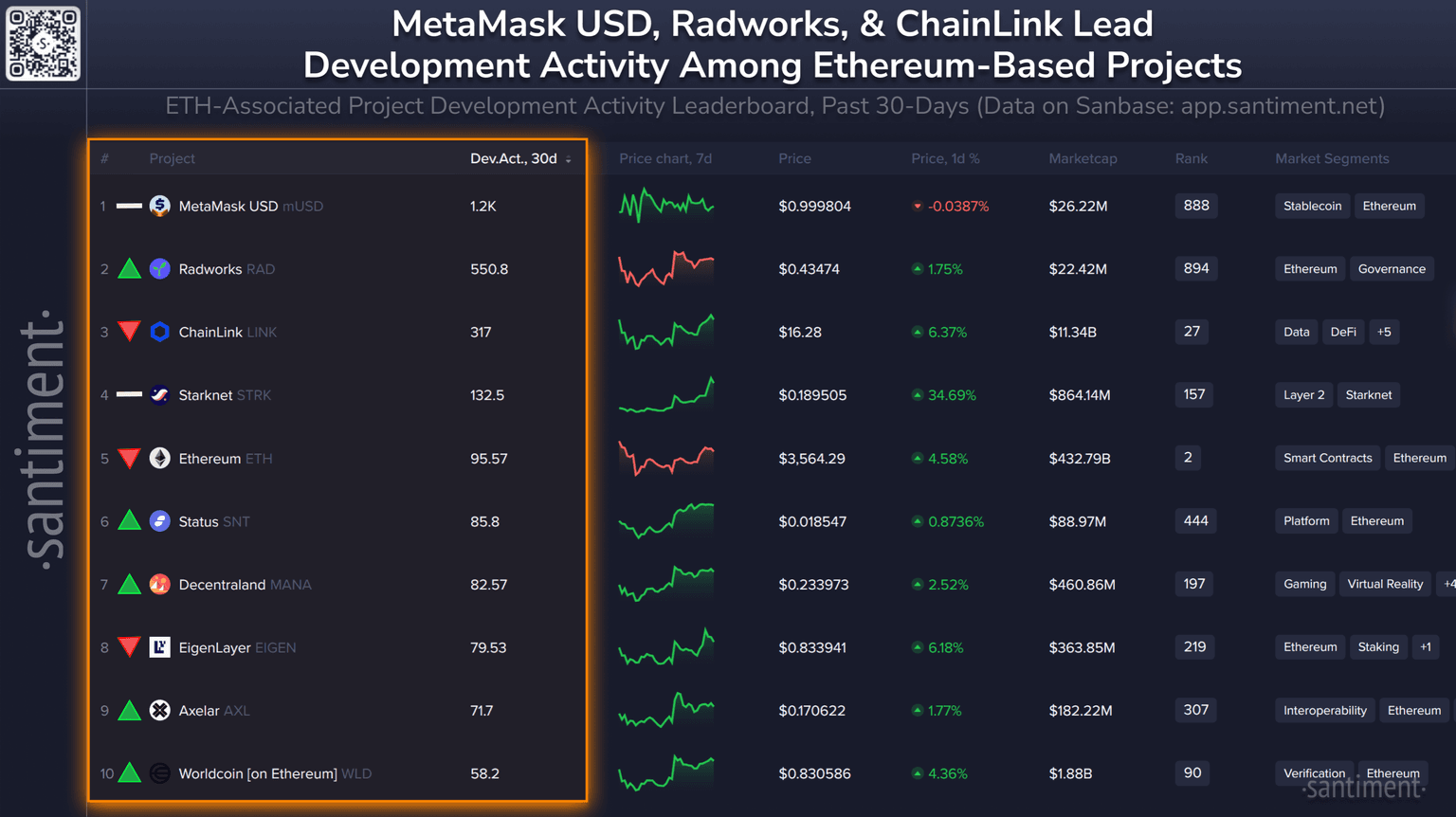 π§βπ» Here are crypto's top coins that are partially or fully associated with the Ethereum-based ecosystem, by development activity. Directional indicators repr
