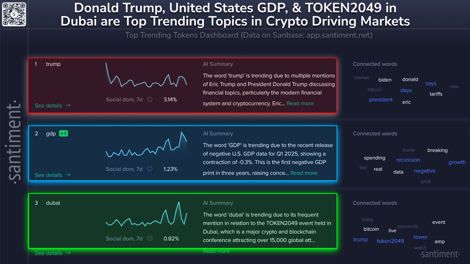 πΊπΈ Donald Trump: Trending due to multiple mentions of Eric Trump and President Donald Trump discussing the modern financial system and cryptocurrency. Eric Trump emphasizes the need for banks to adopt crypto or face extinction, highlighting Bitcoin as a solution to a broken financial system. Additionally, President Trump comments on the stock market and economic policies, linking his statements to crypto and tariffs.