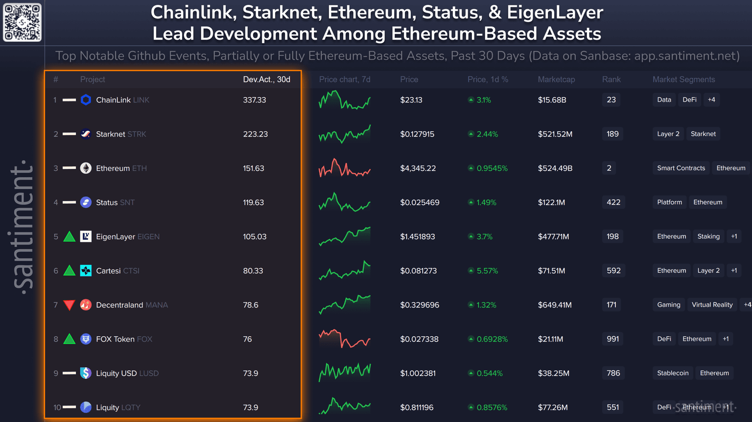 π§βπ» Here are crypto's top coins that are partially or fully associated with the Ethereum-based ecosystem, by development activity. Directional indicators repr