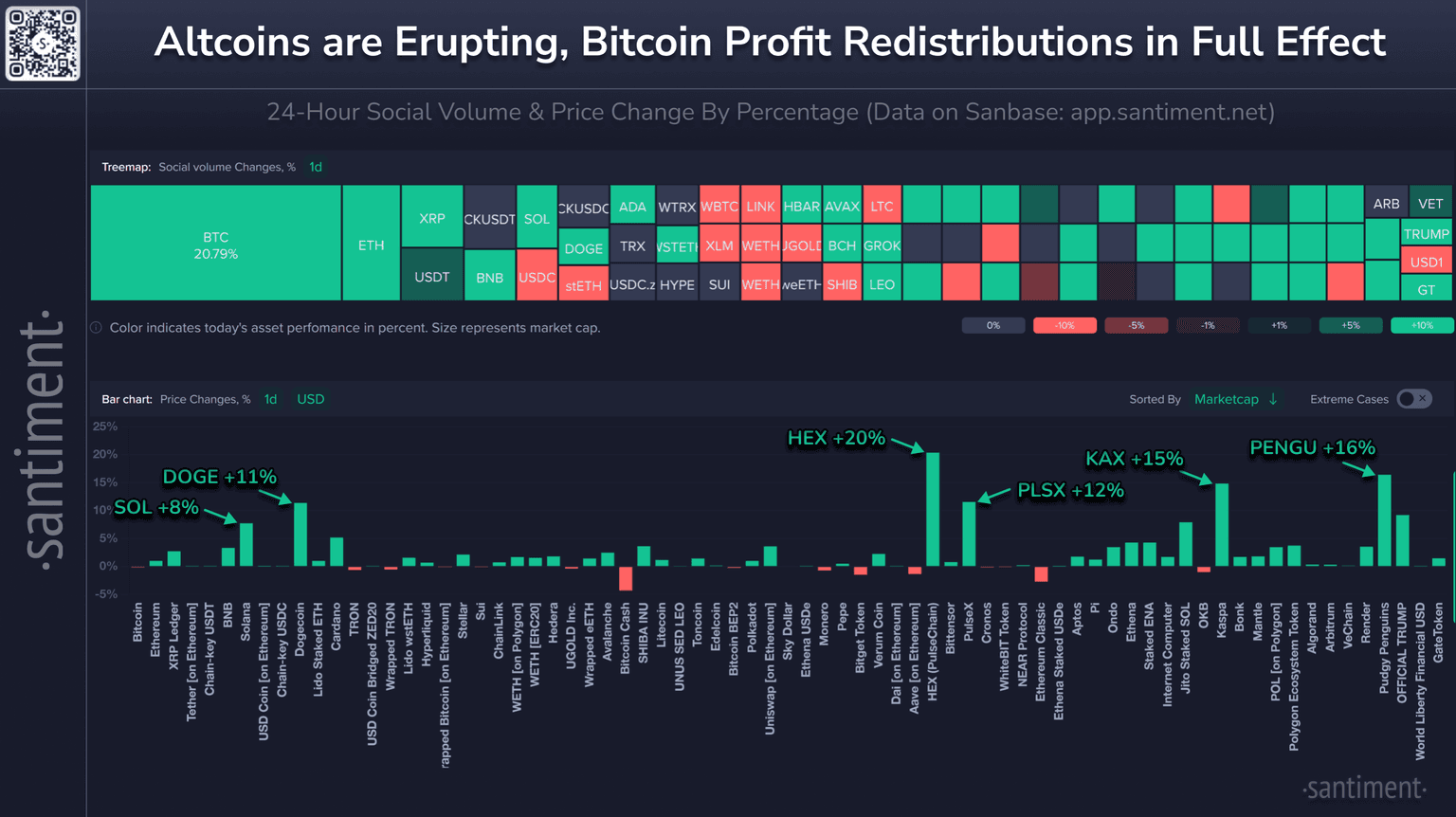 π₯³ Altcoins are surging after Bitcoin's ATH led to profit redistributions. In the past 24 hours, gains include: π $SOL +8% π $DOGE +11% π $HEX +20% π $PLSX