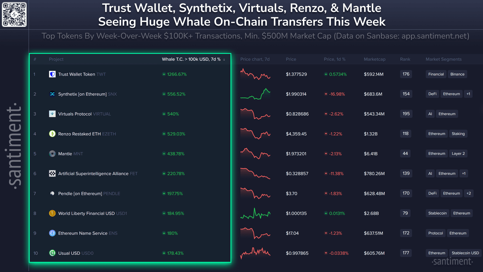 π When whales become active, coin prices are significantly more likely to deviate from the altcoin pack. These are the coins with the highest percentage increases in $100K+ transfers: