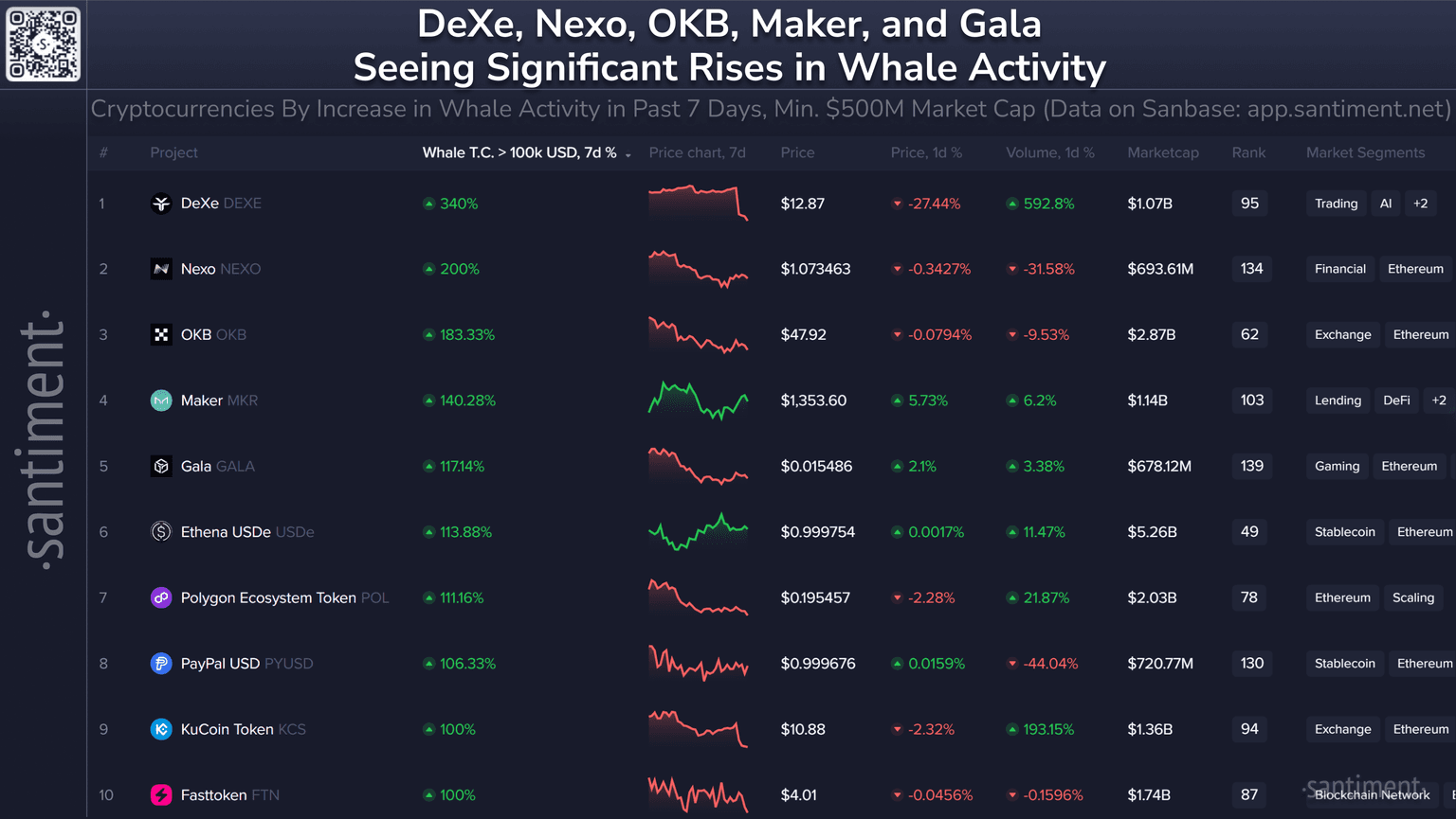 π³ These projects are seeing the highest rises in whale transactions ($100K+ or more) over the past week: πͺ 1) DeXe $DEXE πͺ 2) Nexo $NEXO πͺ 3) OKB $OKB πͺ 4)