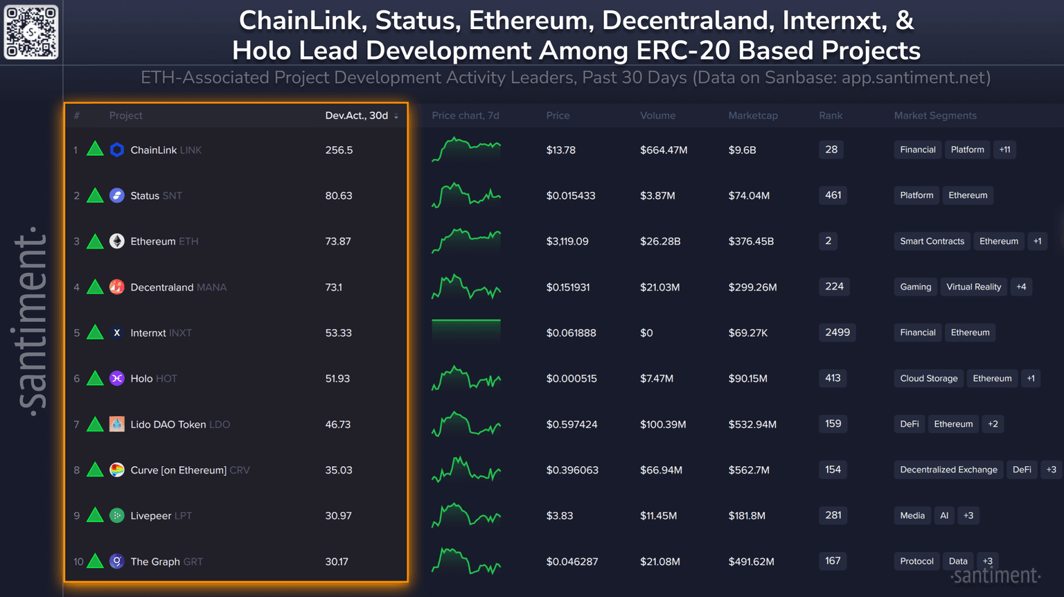 π§βπ» Here are crypto's top coins that are partially or fully associated with the Ethereum-based ecosystem, by development activity. Directional indicators repr