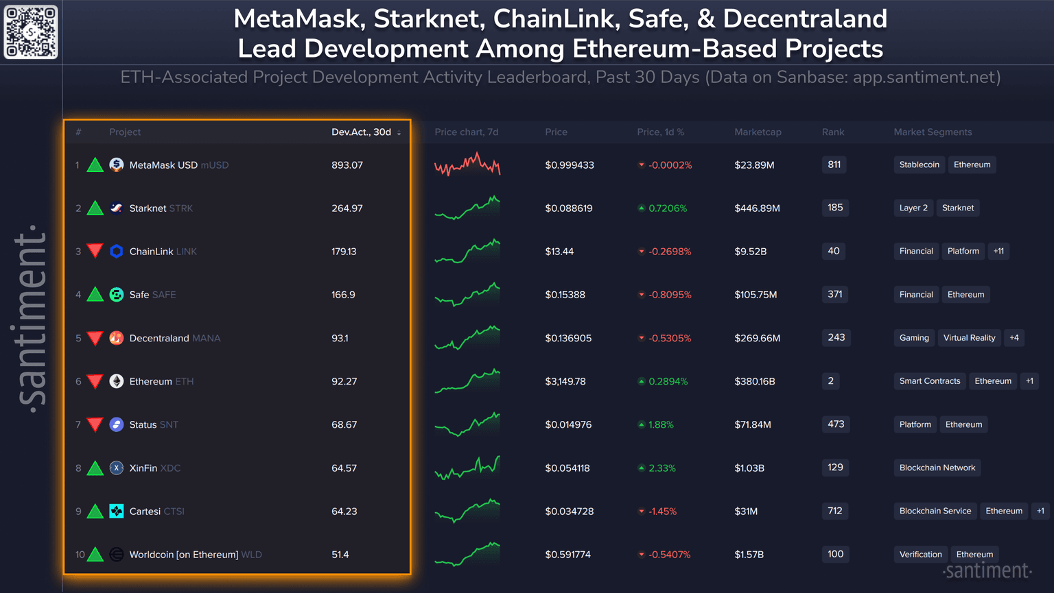 π§βπ» Here are crypto's top coins that are partially or fully associated with the Ethereum-based ecosystem, by development activity. Directional indicators repr