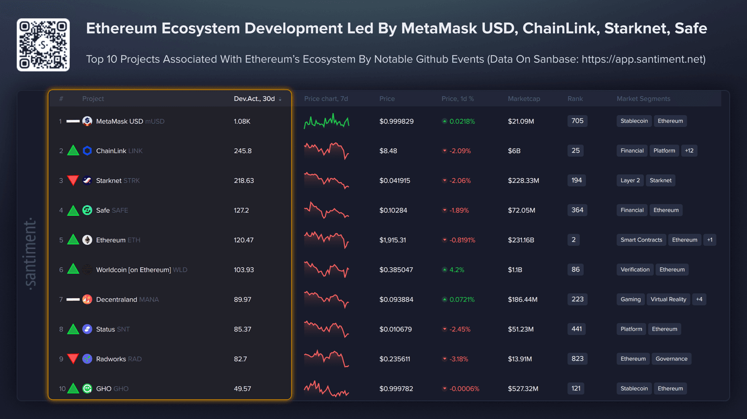 π§βπ» Here are crypto's top coins that are partially or fully associated with the Ethereum-based ecosystem, by development activity. Directional indicators repr