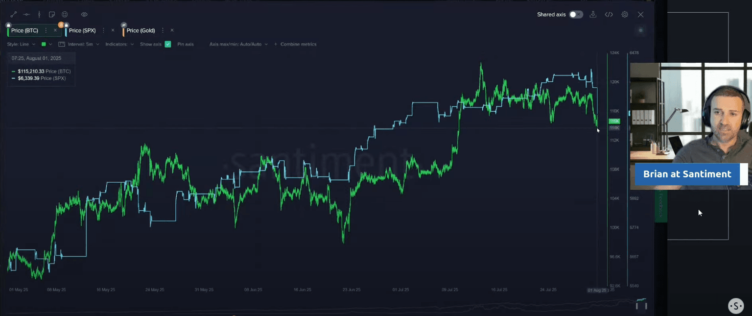 The close relationship between Bitcoin and the stock market is undeniable right now. Brian showed a chart where Bitcoin's price movement is tightly mirroring the S&P 500. In a classic flight to safety, gold is moving in the opposite direction of both Bitcoin and stocks, rallying on the back of economic uncertainty.