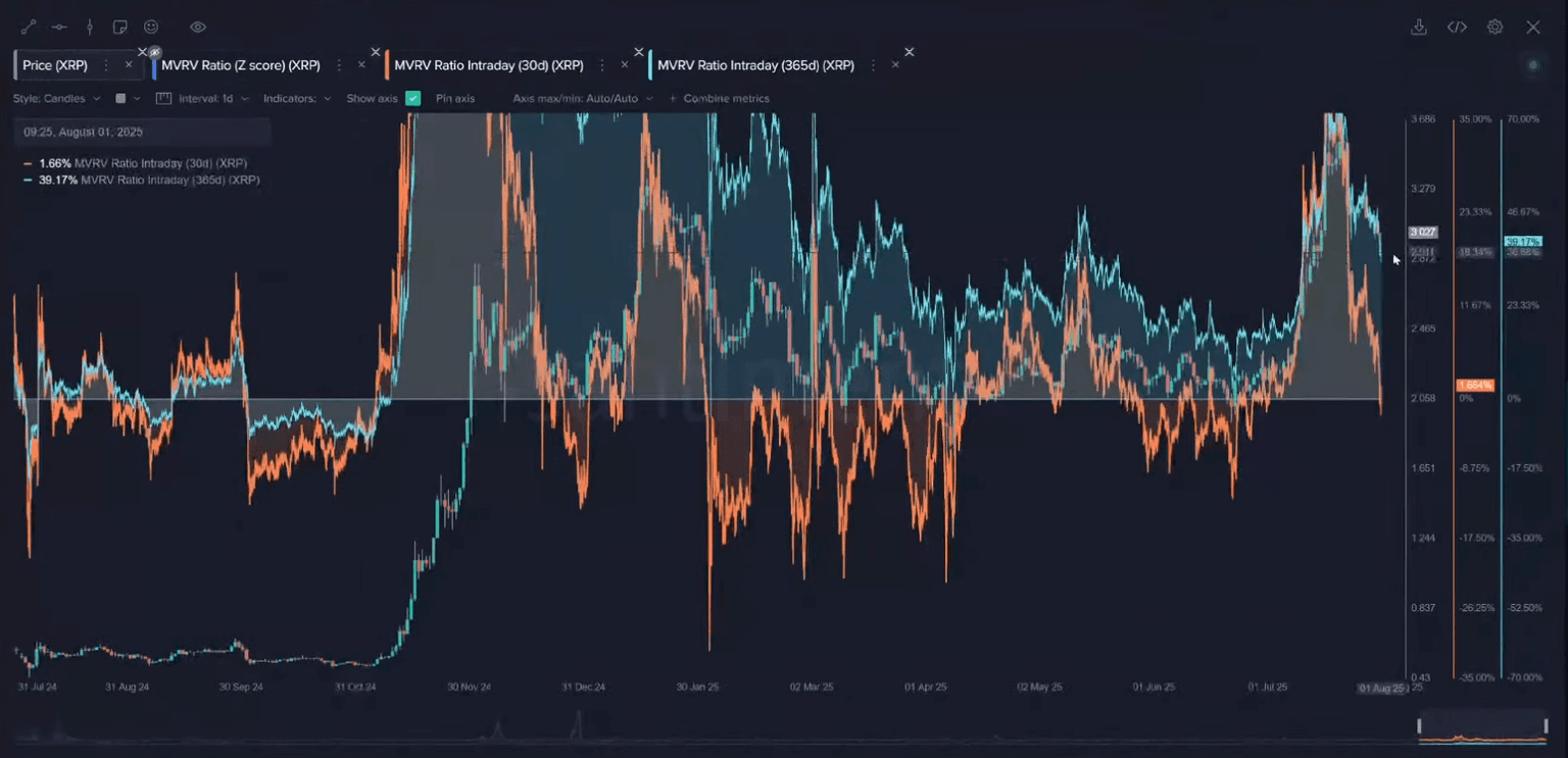 XRP's incredible 77% price rally was a major story in July, but on-chain data offered a clear warning sign at its peak. The MVRV ratio, which indicates the average profit of all holders, soared to unsustainable levels. At the top, the 365-day MVRV was over +70%, signaling the market was extremely overheated.
