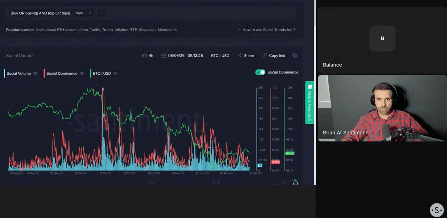 - Key Data: Social mentions of "buy the dip" are showing a pattern of declining peaks, suggesting crowd exhaustion.