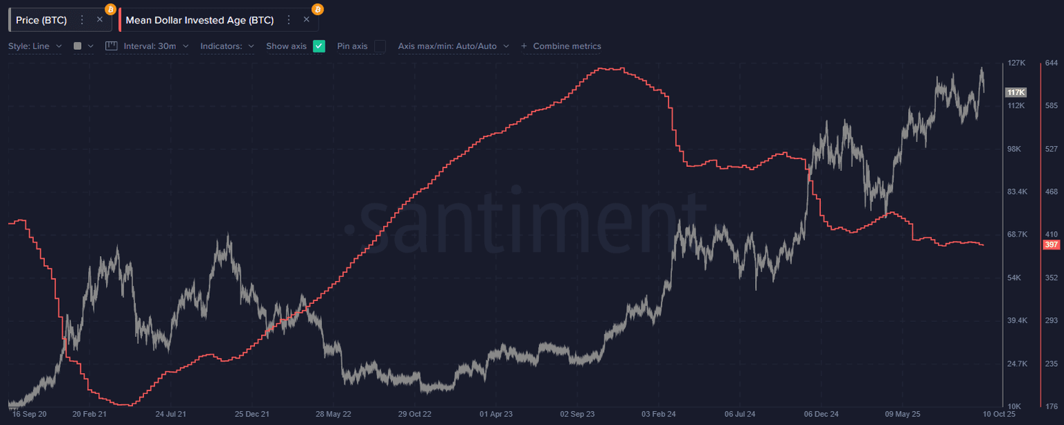 - Key Data: The Mean Dollar Invested Age for Bitcoin has dropped by 10.4% in the last four months, from 443 days to 397 days.