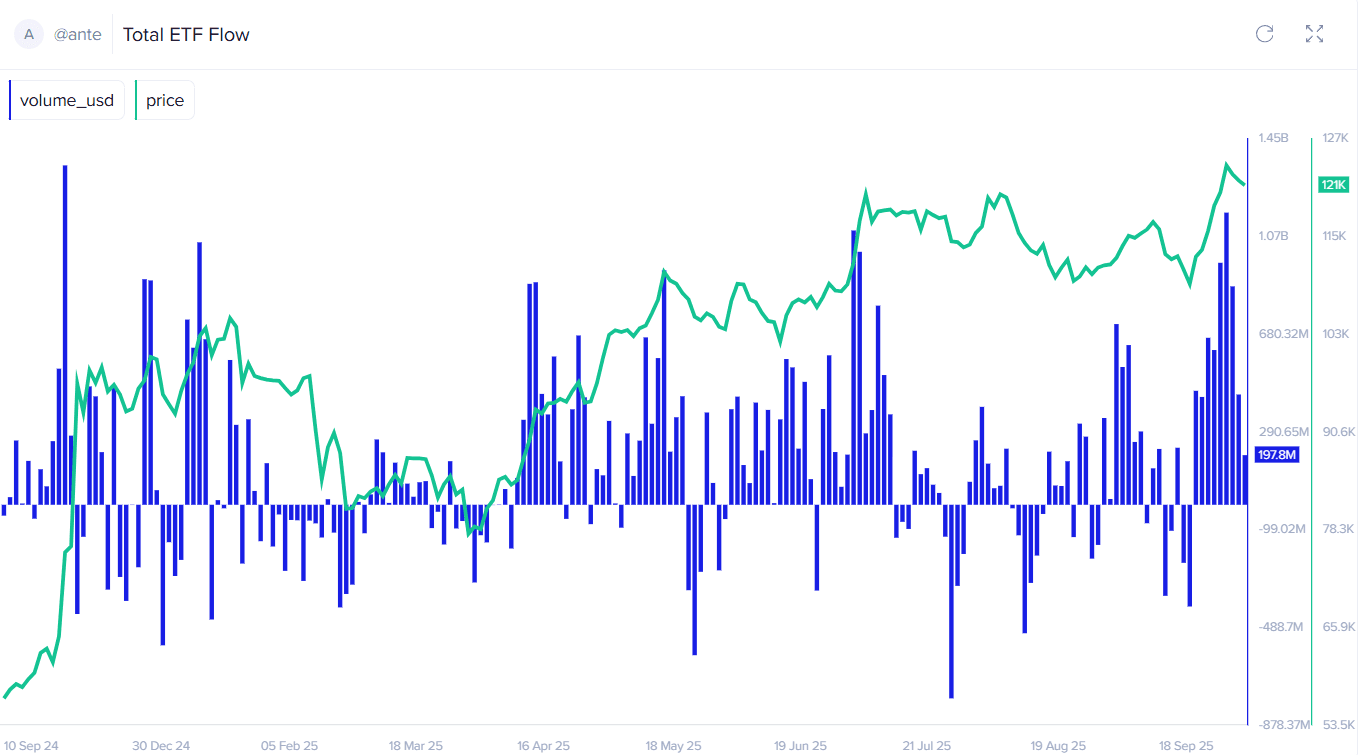Money is flowing into Bitcoin ETFs at an aggressive rate. The market saw a massive peak on October 6th, when a net total of $1.16 billion flowed into these funds in a single day. These inflows are a powerful measure of both institutional and retail confidence. However, such massive spikes often act as indicators of a local top, signaling that excitement has peaked.