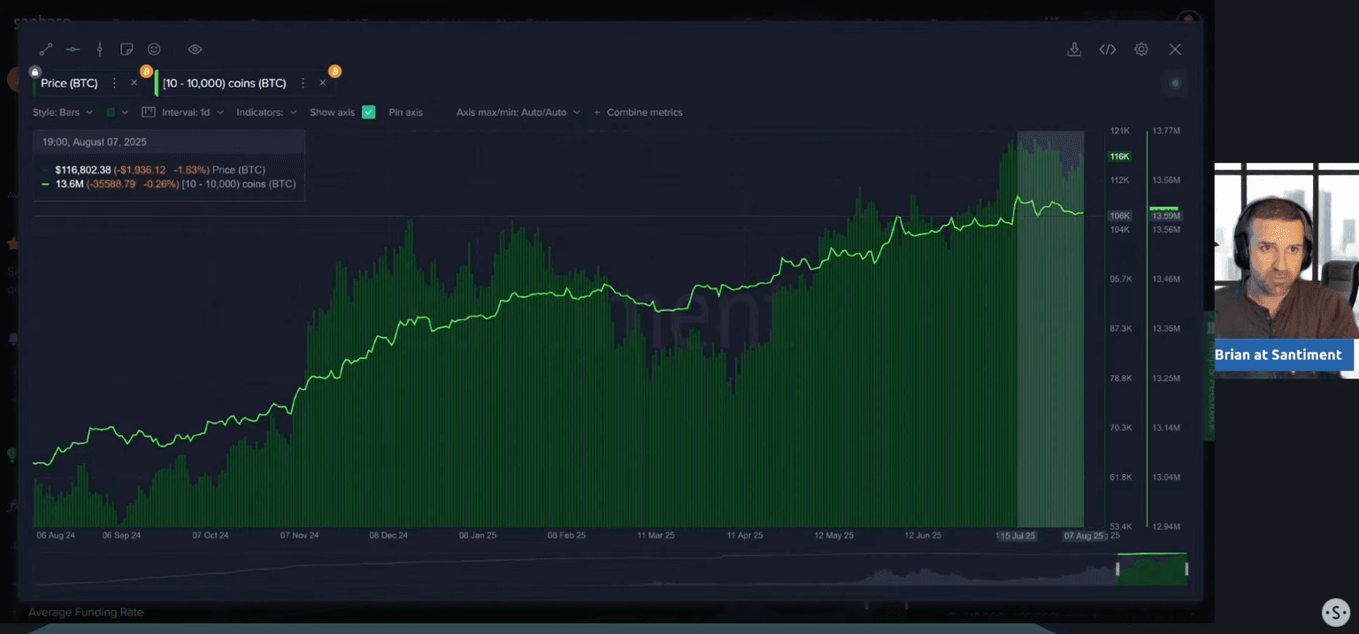 While altcoins celebrate, a concerning trend is emerging on the Bitcoin network. The holdings of key stakeholders—wallets with 10 to 10,000 BTC—have been declining slightly since mid-July. These "whale" and "shark" wallets are crucial for driving sustained bull runs.
