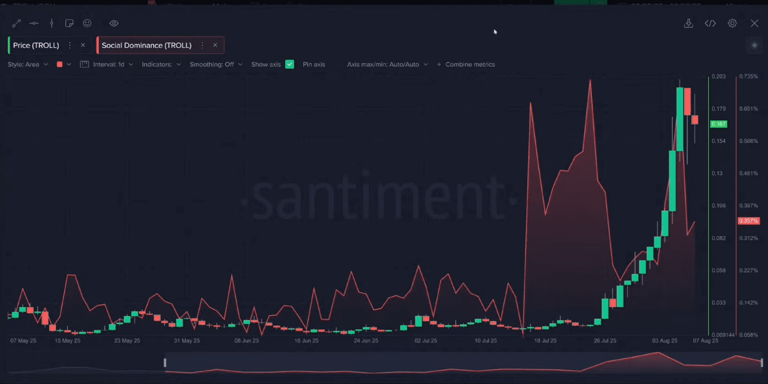 The TROLL token provided a perfect example of memecoin market dynamics. The coin surged over 1,000% before retracing. By looking at its social dominance, Brian showed a classic pattern: the public only took notice after the massive price run.