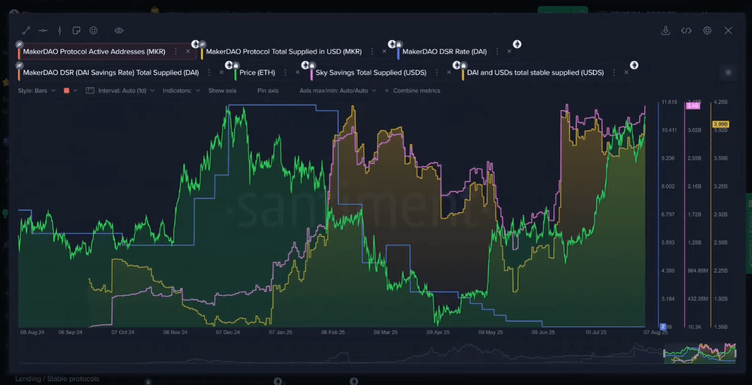 Maksim shared a custom metric he uses to gauge market sentiment, which combines stablecoin deposits into the "safe" yield protocols of MakerDAO and Spark. He explained that when deposits into these protocols are high, it reflects fear and a desire for stable, low-risk returns.