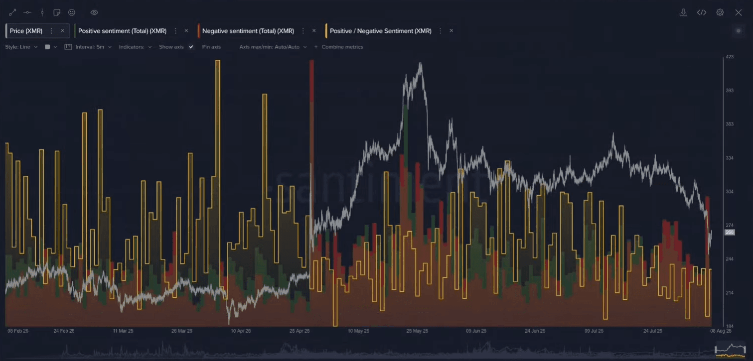In stark contrast to the market leaders, privacy coin Monero (XMR) showed signs of extreme bearishness. The data revealed a spike in social volume combined with deeply negative sentiment, a pattern often associated with capitulation.