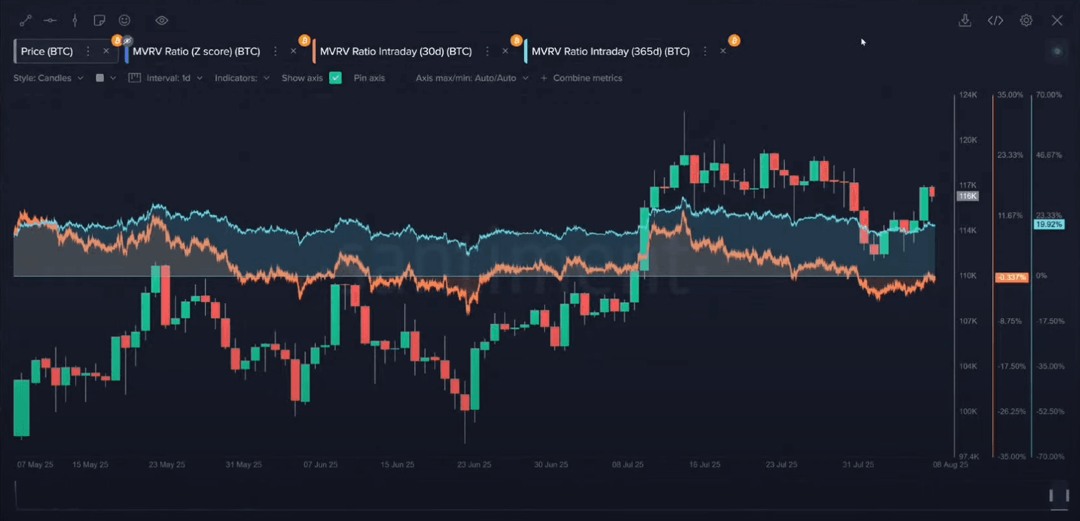 The MVRV (Market Value to Realized Value) ratio measures the average profit or loss of all holders of an asset. For Bitcoin, the 365-day MVRV shows that the average long-term holder is up about 20%. While the 30-day MVRV is neutral, the high long-term value signals caution.