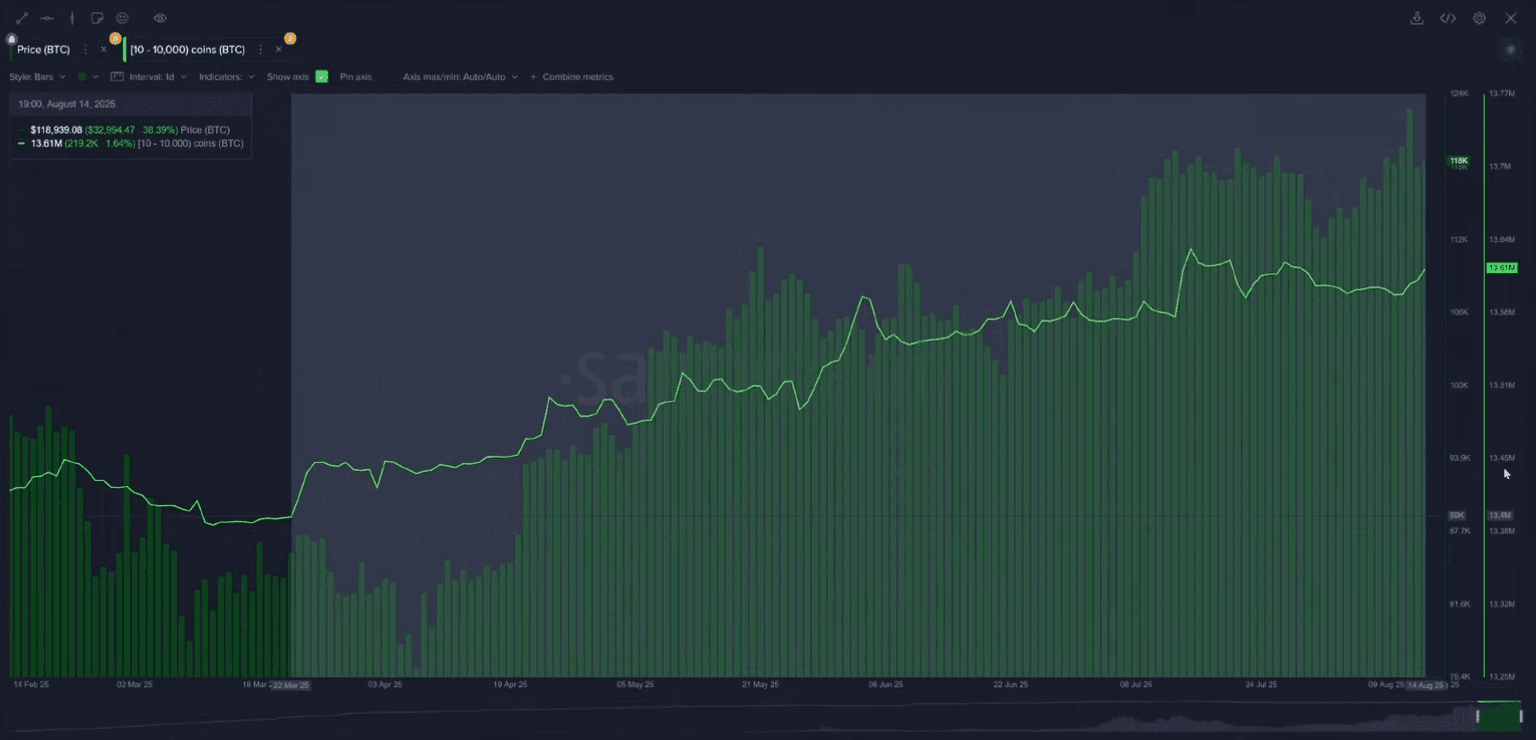 In a surprisingly bullish sign, Bitcoin's largest holders are not selling into this rally. Wallets holding between 10 and 10,000 BTC have continued to accumulate aggressively, even after the all-time high. In just the last 72 hours, this cohort added another 23,000 BTC to their holdings. This suggests they believe prices have further to climb.