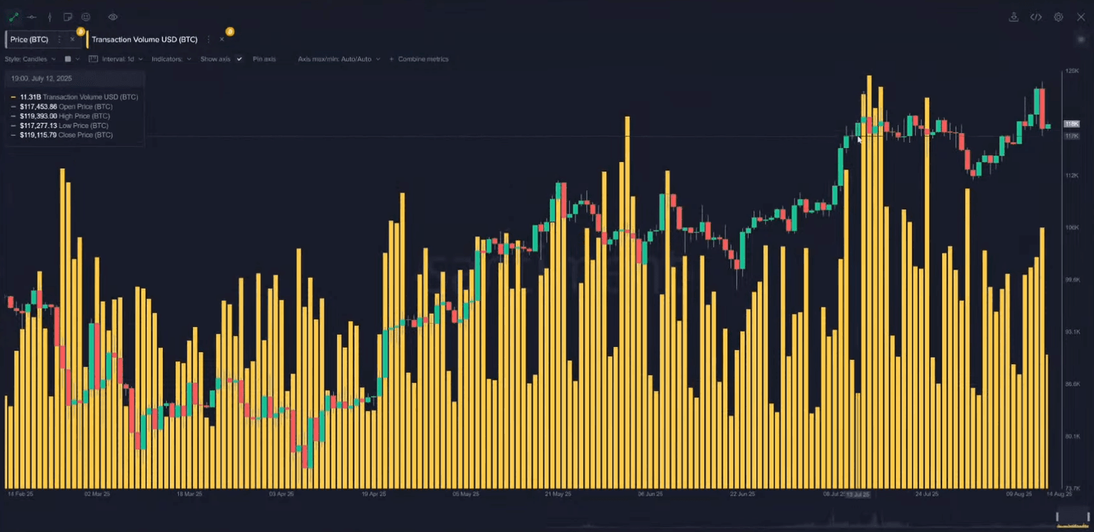 A concerning signal has appeared in Bitcoin's on-chain activity. While the price was setting a new record on August 13th, the daily transaction volume was only 48.87 billion peak seen a month prior when the price was lower. This is a classic bearish divergence, just one data-point to suggest the rally may be overheated.