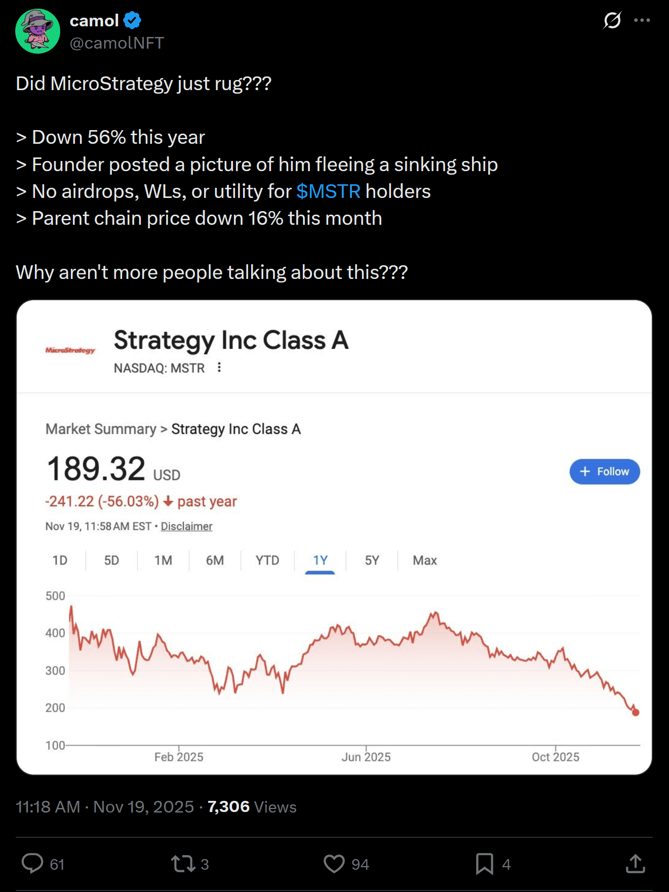 - Key Data: There is ongoing discussion about the potential for large corporate Bitcoin holders, like Microstrategy, to face liquidation if the market stays suppressed.