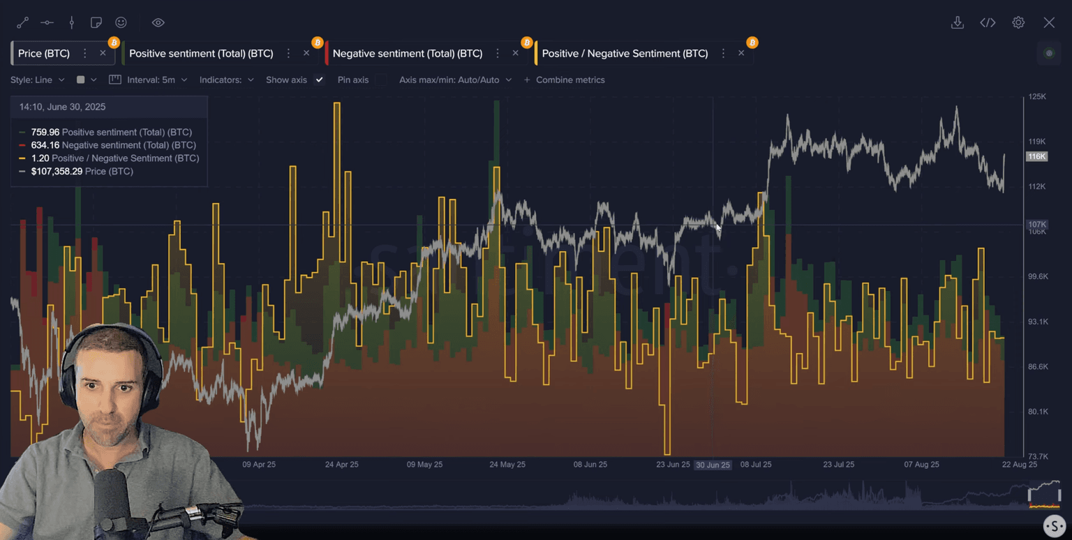 The analyst shared a unique sentiment metric(see first chart in this link) that tracks the ratio of comments discussing prices going "higher" versus "lower." For Bitcoin, there is a growing bias toward "higher," a pattern that has sometimes preceded price corrections. Interestingly, the same metric for Ethereum shows that conversations are still relatively dormant, suggesting ETH may still have room to run before becoming overhyped.