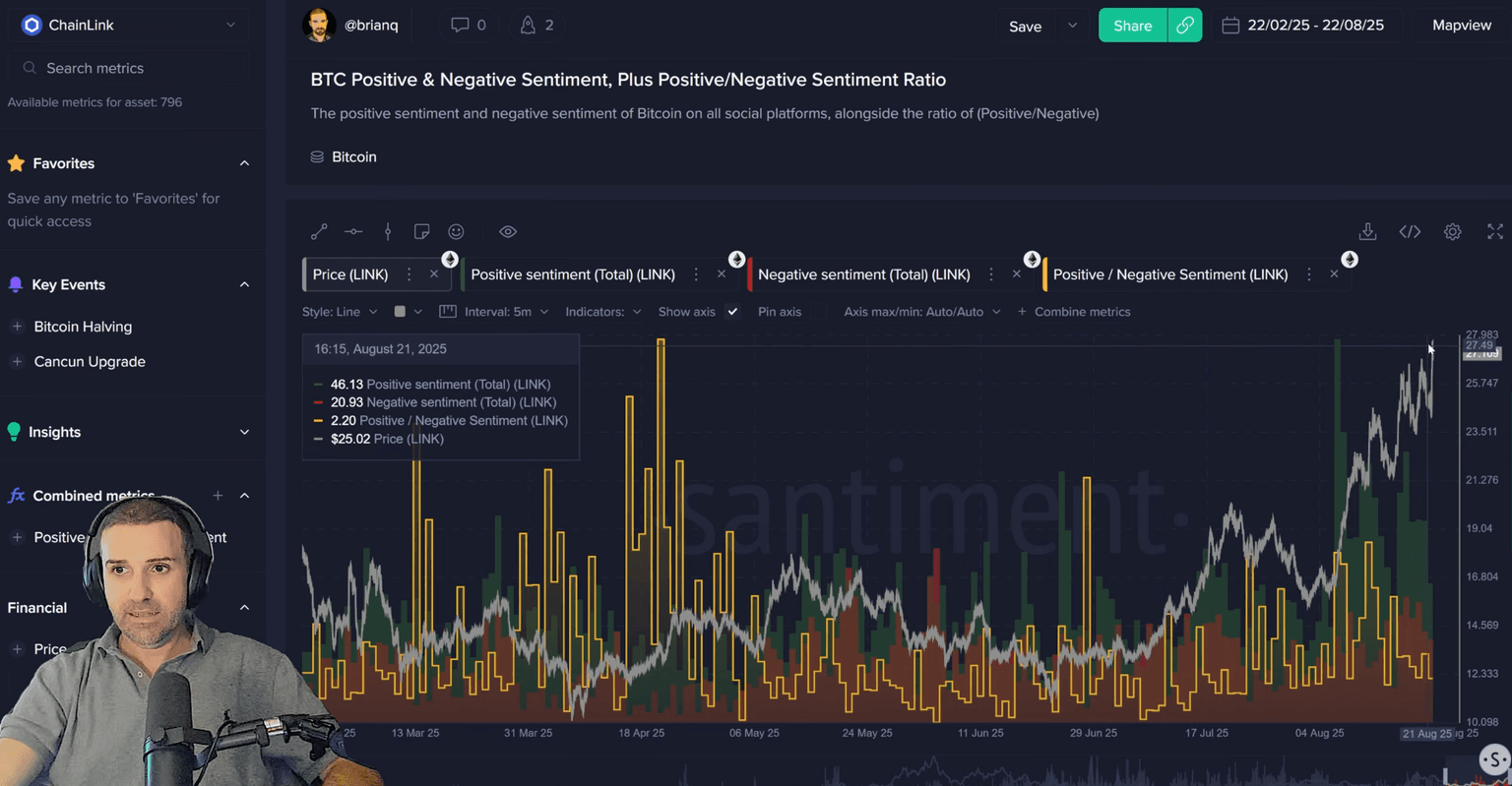Brian showed off the Activity Matrix, a powerful model for identifying market anomalies by ranking assets on on-chain and social metrics. Assets marked "hot" (red), like Chainlink and API3, are seeing peak levels of activity, which can sometimes signal an impending trend reversal. Conversely, "cold" assets are seeing very little activity.
