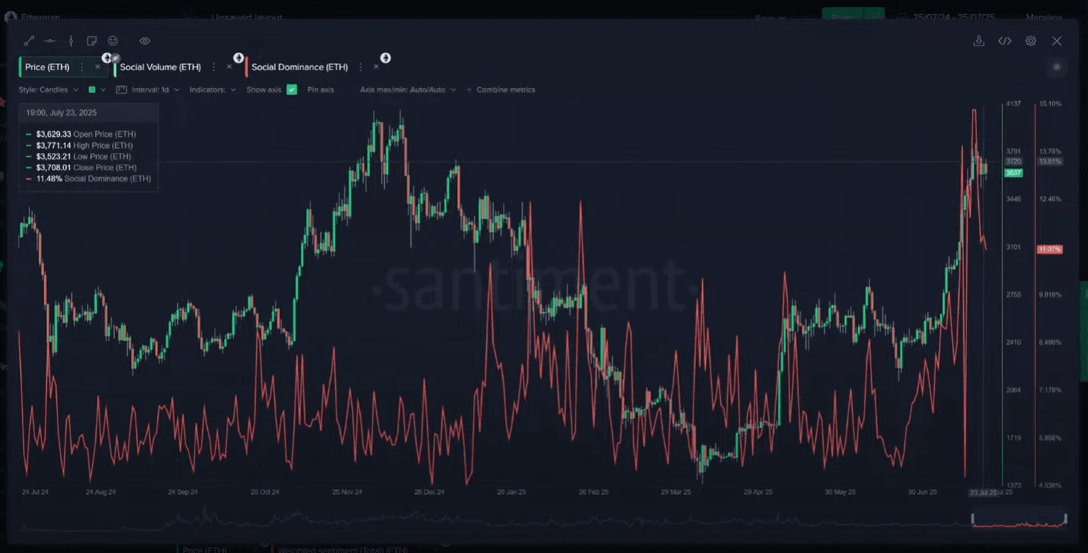 The conversation returned to Ethereum, where social metrics are flashing warning signs. Since early May, Ethereum's price ratio against Bitcoin has surged by an incredible 70%. This has led to extreme euphoria and a massive spike in social dominance, which is often a red flag.