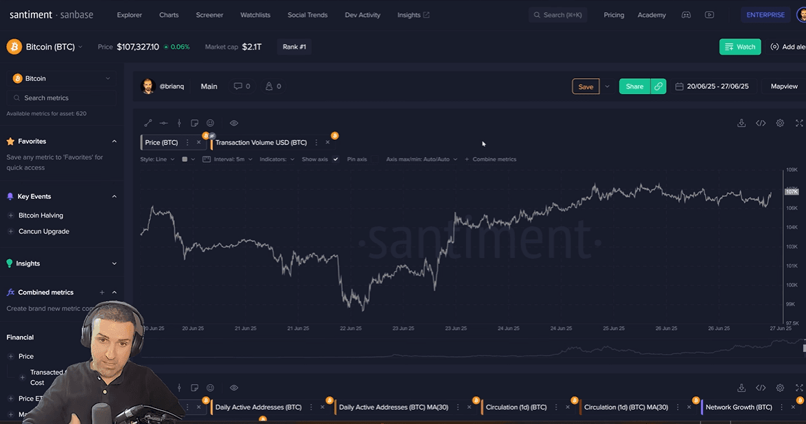 One of the most powerful insights from the stream was how sentiment data pinpointed the market bottom. On the day of the airstrikes, sentiment for both Bitcoin and Ethereum plummeted to a one-month low. Brian identifies this moment of extreme fear as an "ideal point to actually buy." True to form, the market began a sharp rally almost immediately after sentiment bottomed out.