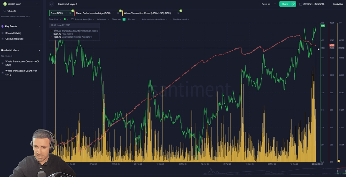 In a surprising turn, Bitcoin Cash (BCH) is showing extremely bullish on-chain signals. Brian highlights a massive spike in whale transactions involving BCHβthe largest seen all year. This is supported by other metrics, including rising social dominance and a shrinking "mean dollar invested age," which signals that dormant coins are moving.