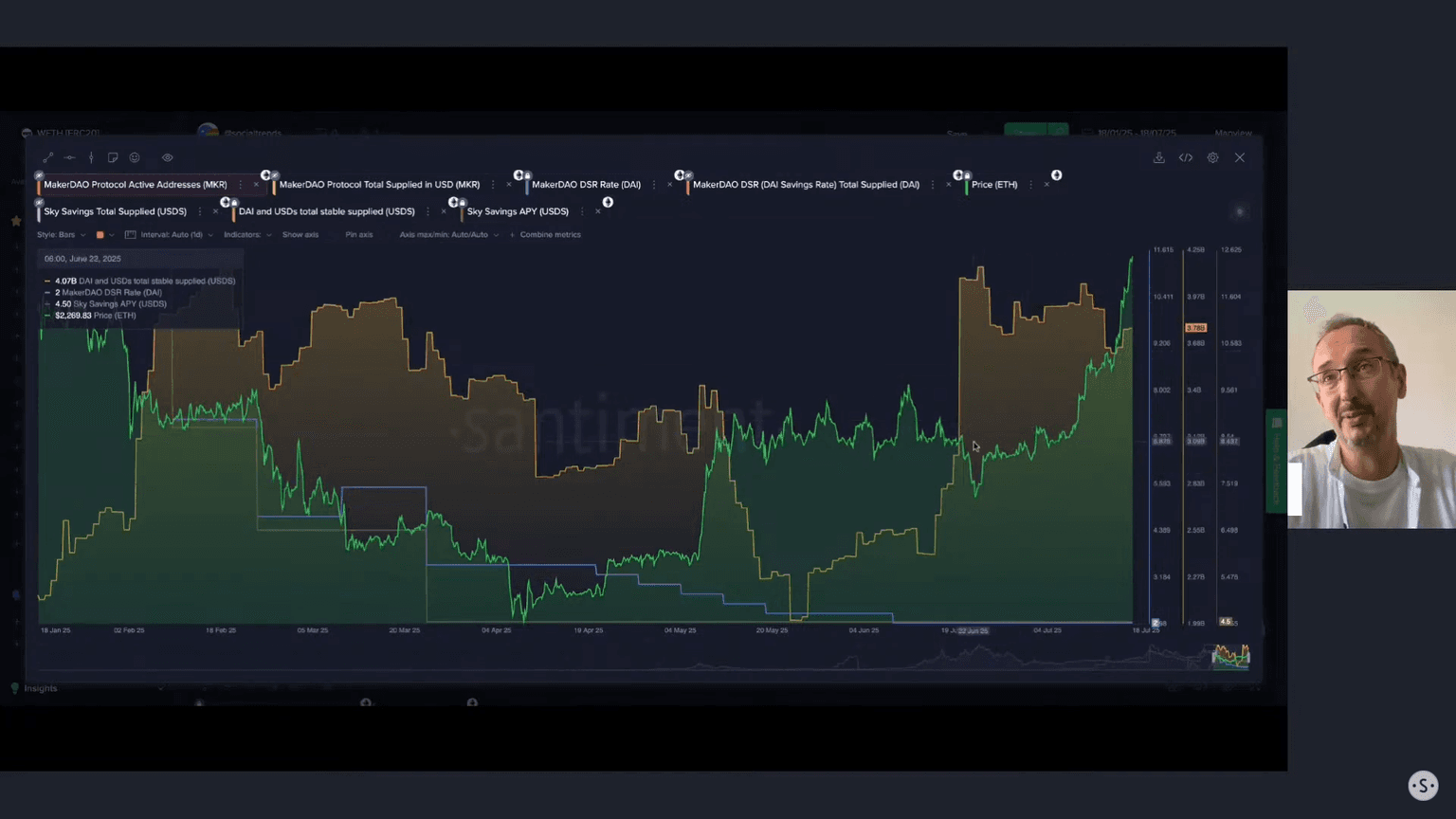 Shifting from social metrics to on-chain data, Maksim examines borrowing and lending activity within DeFi. He starts by analyzing the behavior of stablecoin holders, particularly how much DAI and USDC are being supplied to low-risk yield vehicles. The core logic is to understand market participants' risk appetite. When investors are content with a safe 4-5% yield, it suggests they are not confident enough to deploy that capital into riskier assets.