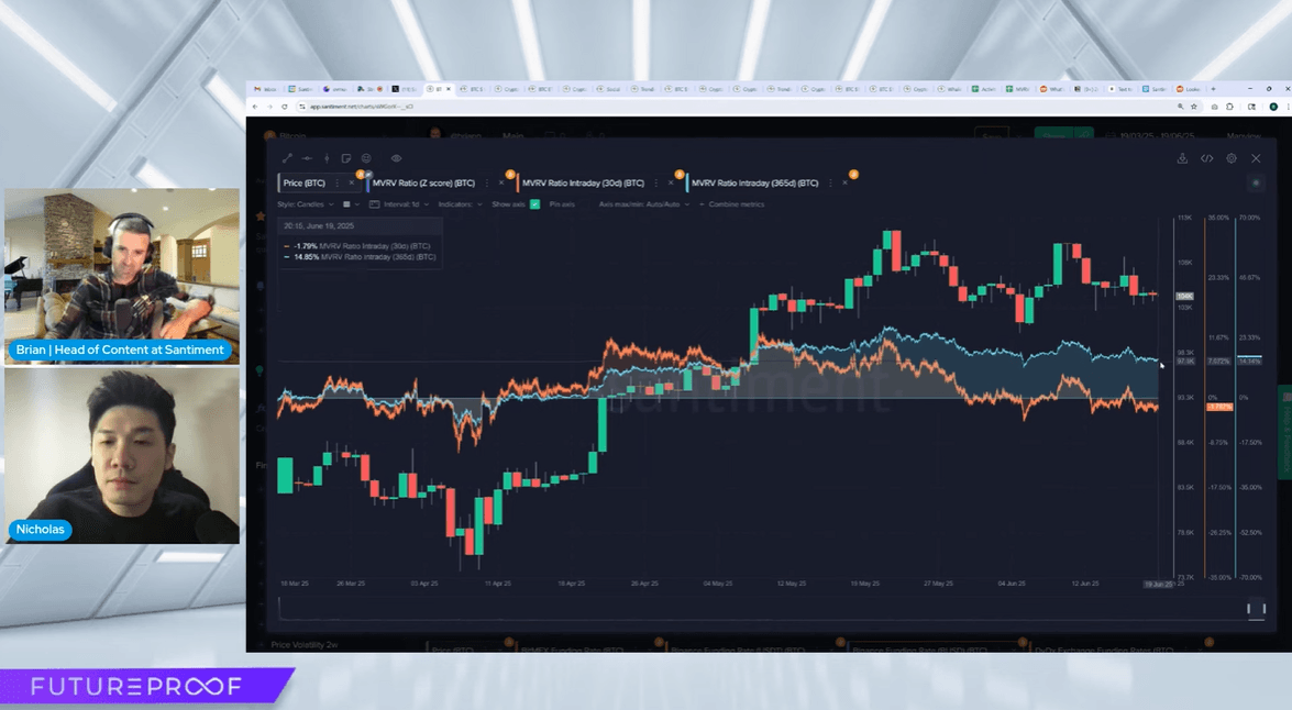 To gauge trader profitability, Brian introduced the MVRV (Market Value to Realized Value) metric. The 30-day MVRV sits at -1.8%, meaning the average short-term trader is slightly underwater. However, the 365-day MVRV shows long-term holders are still up by a healthy +15%. For the lowest-risk buying opportunity, you'd ideally want to see both metrics below 0%.
