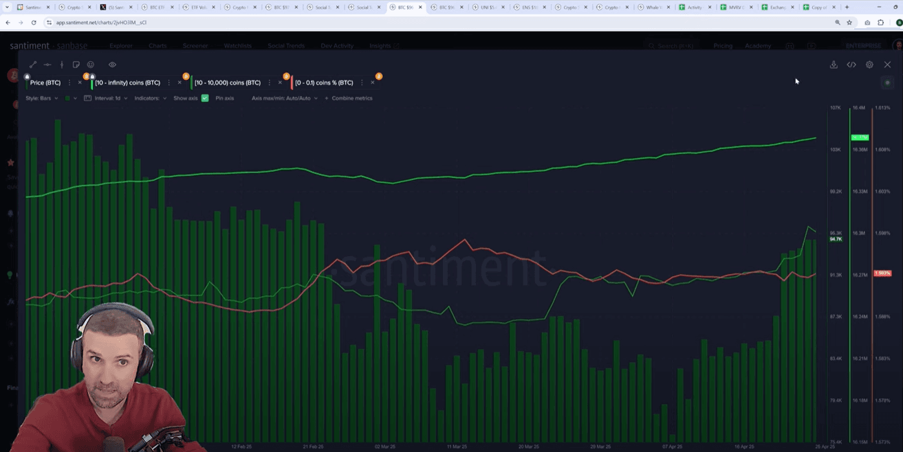 Large holders with 10-10,000 BTC accumulated significantly between April 7-24, adding 67,217 Bitcoin (around 3,500-4,000 BTC daily). However, the past six days show these whales taking profit, dumping approximately 15,875 Bitcoin. This creates a bearish divergence where price continues upward while whale holdings decrease β a pattern with strong historical correlation to subsequent price action.