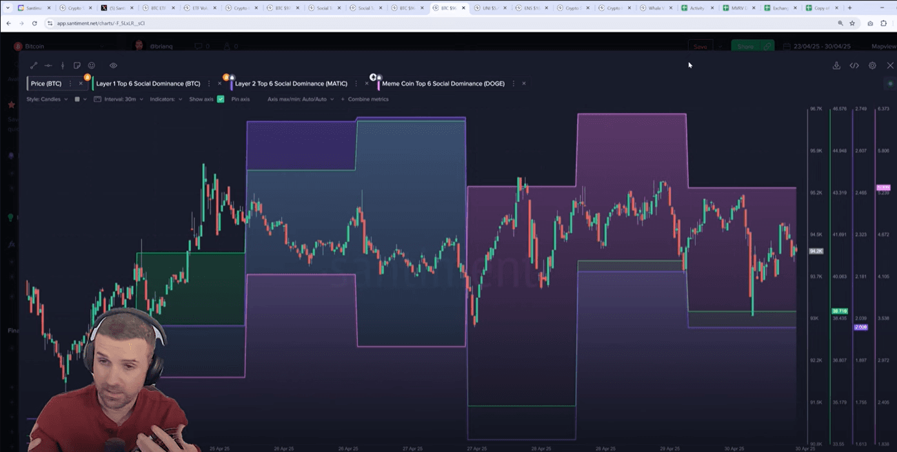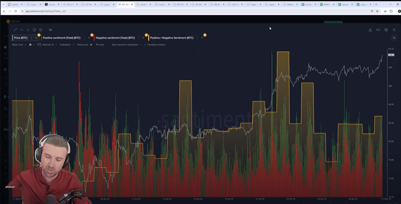 Bitcoin's positive-to-negative commentary ratio across social media shows concerning patterns that historically precede corrections. When sentiment reached very bullish levels on April 23rd, a short-term price drop followed. Currently, sentiment is approaching the bullish range again, which typically signals market tops as retail enthusiasm peaks. The neutral sentiment zone has historically been safer for sustained growth.