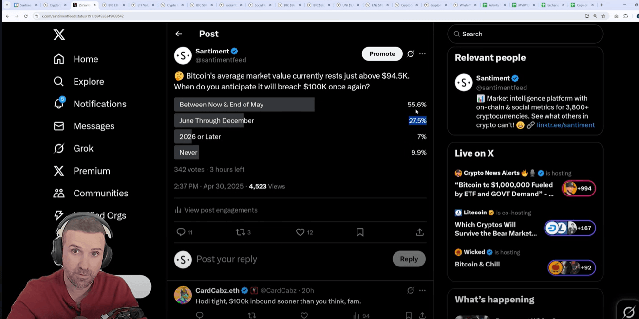 Bitcoin has enjoyed a solid three-week bull run since bottoming around April 10-11, recovering to 80K. Market sentiment has flipped bullish following price action rather than preceding it β a typical pattern where traders become optimistic after seeing positive movement.