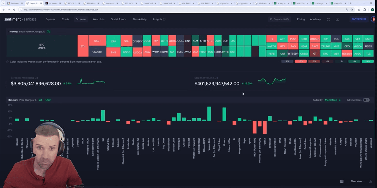 The total cryptocurrency market cap increased 5.1% over the past week to nearly 41.6 billion weekly. Social metrics show Bitcoin discussions up 4% while Ethereum conversations surprisingly decreased. XRP, USDC and Dogecoin saw significant social volume spikes, with Dogecoin discussions centered around potential ETF developments on NASDAQ.