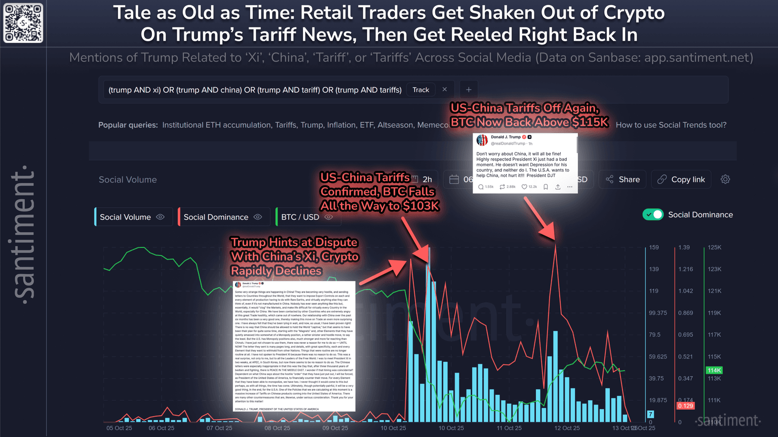 π Yesterday, Trump backtracked and suggested tariffs were being lifted again, and Bitcoin has now swiftly recovered above $115K. This has become an all too common pattern in 2025. Retail gets shaken out by fear, then jump back in after the fear-inducing topic is confirmed to have been overblown or "all for nothing".