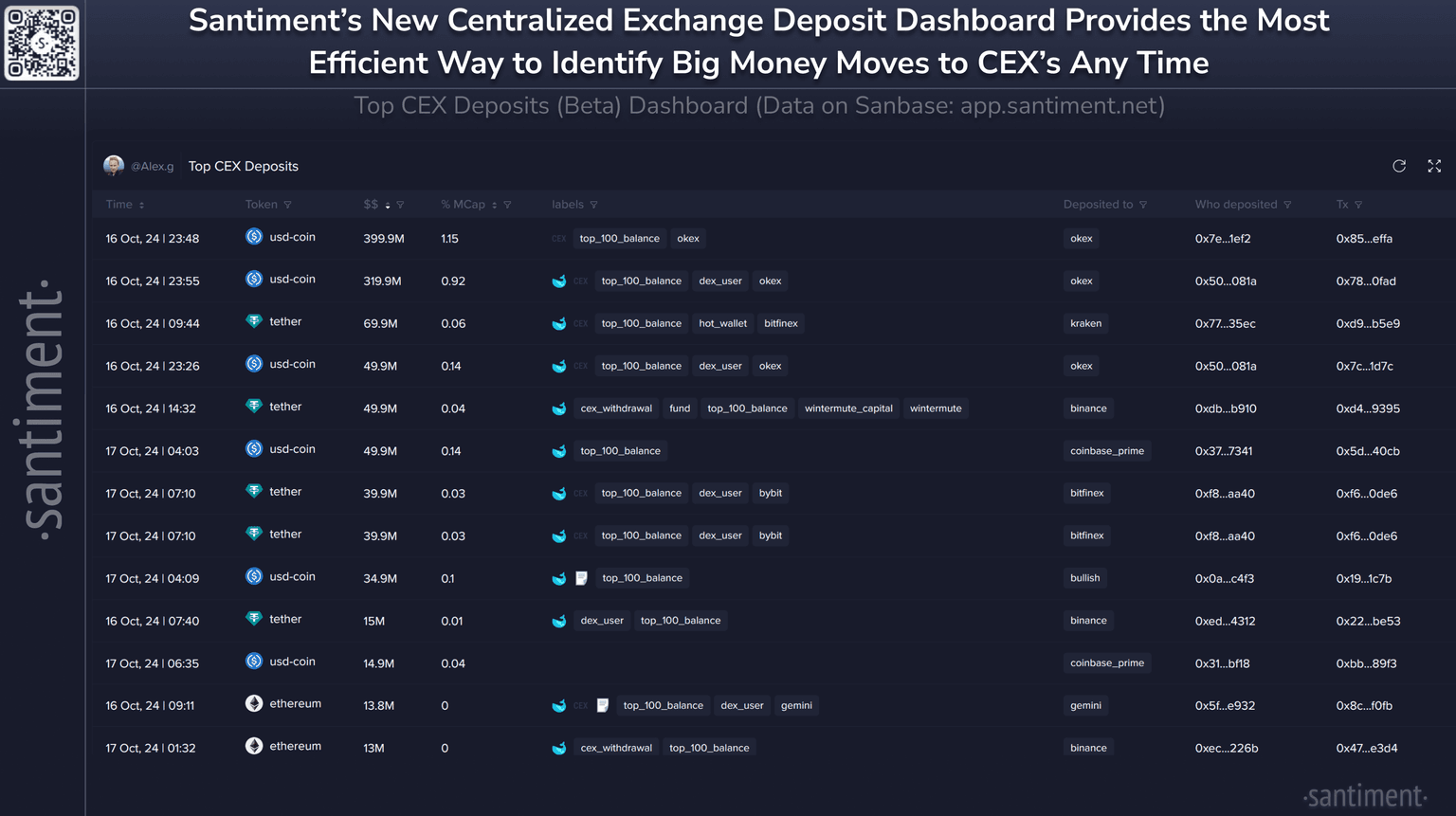 π We are proud to introduce the new and FREE 'Top CEX Deposits' dashboard from @santimentfeed. With this completely free tool, identify the largest deposits ma