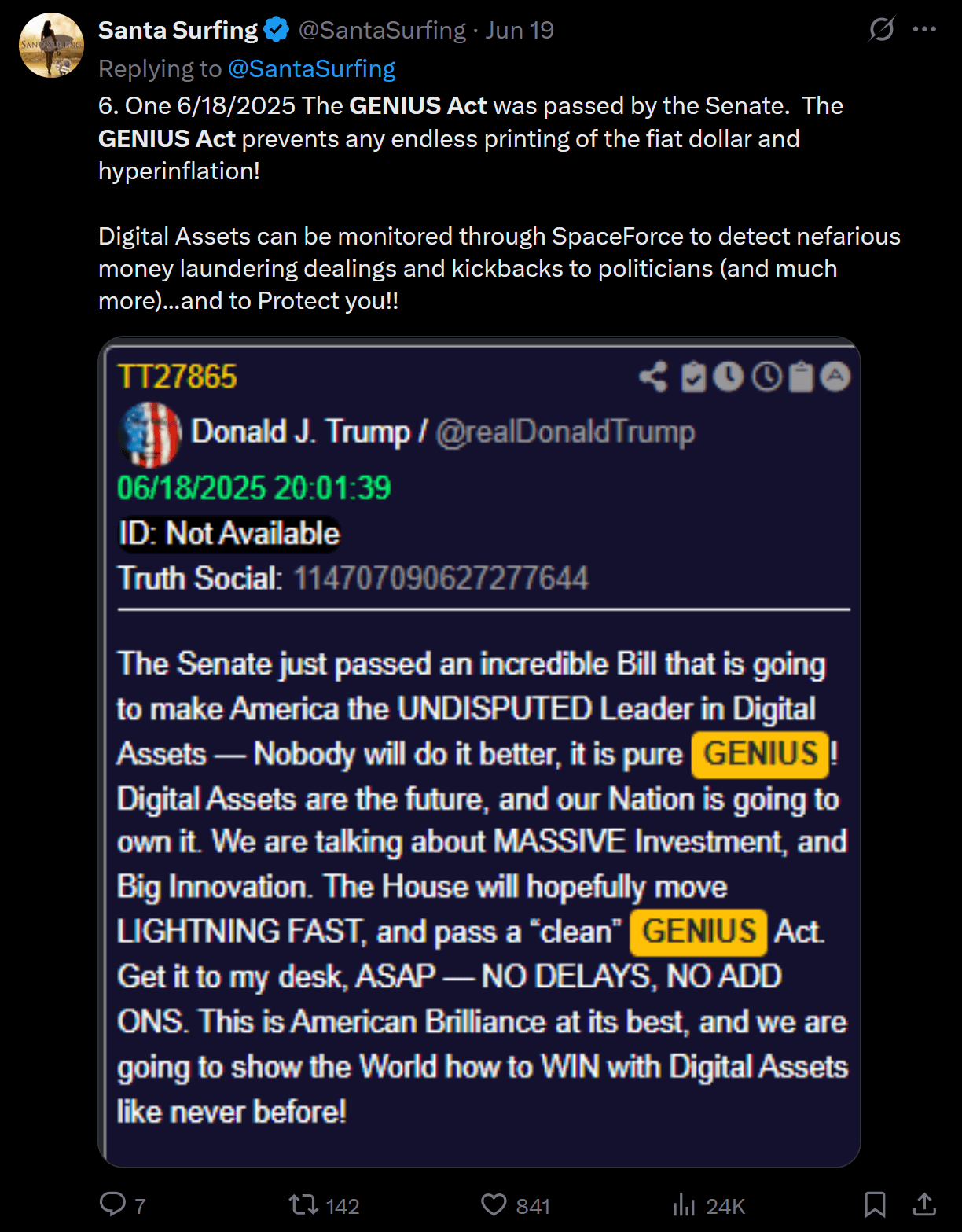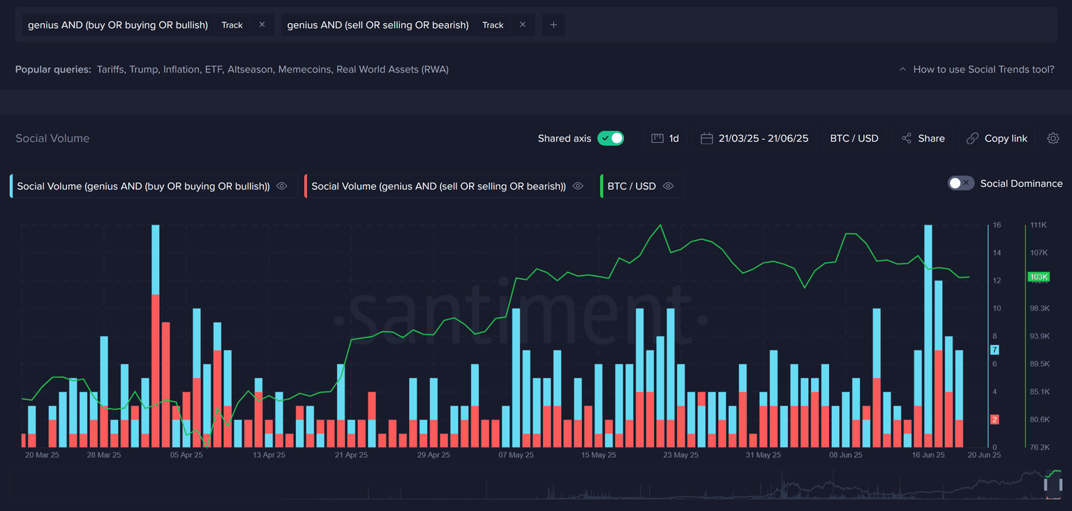 Not everyone’s throwing a party though. Some in the crypto community are worried the bill is too soft on big players and could benefit folks with political connections more than regular users. There’s chatter that parts of the bill might quietly favor projects linked to the Trump family or others with influence. So while it’s a step forward for regulation, it’s also kicked off a debate over fairness and transparency. Overall, we can see on Santiment's Social Trends that there are a lot more bullish on the GENIUS act (in blue) than there are bearish (in red).