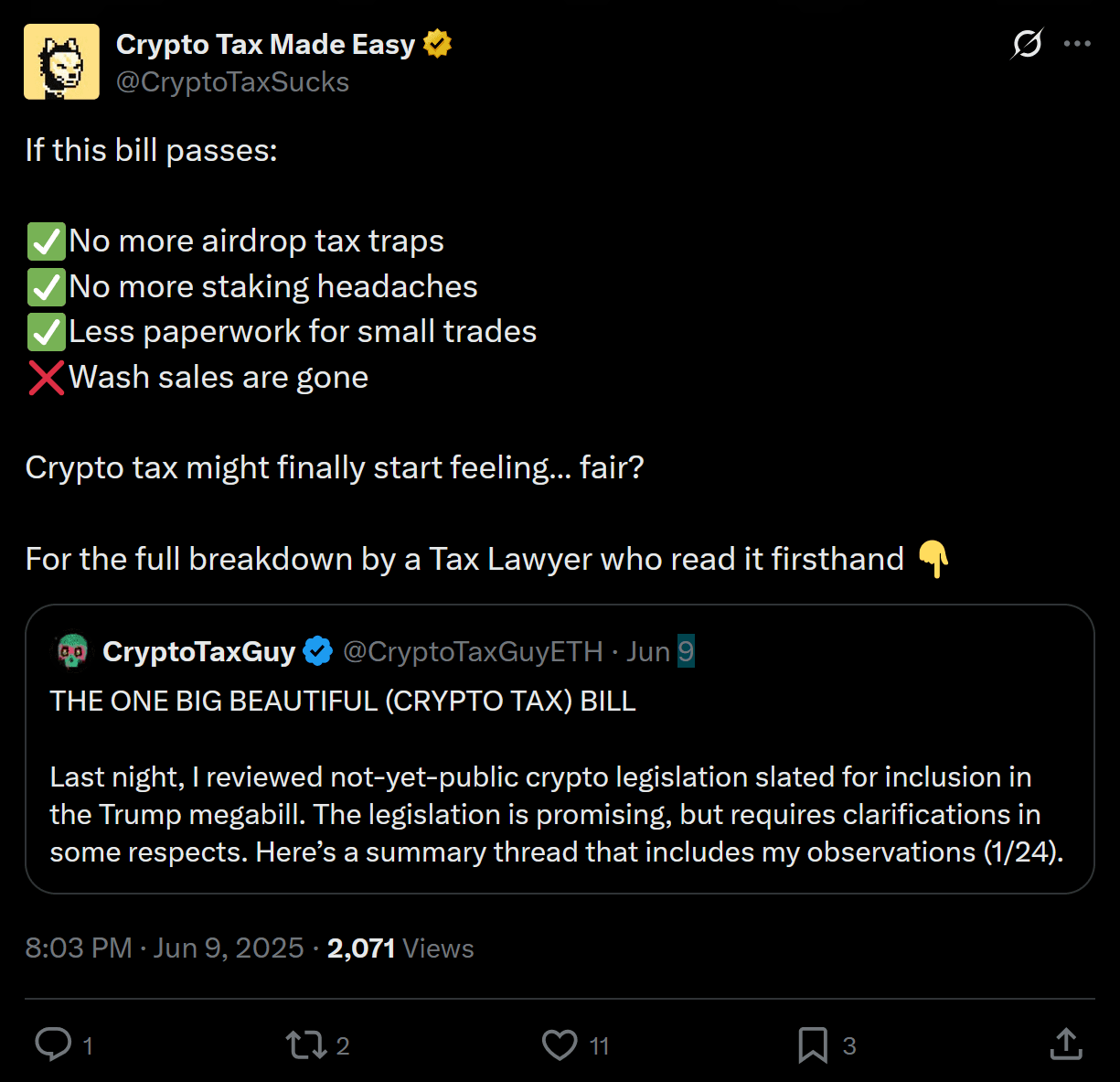 This topic is still heavily polarized, with many acknowledging the real-world downside for the poor and benefits for the rich. But for crypto, some have recognized that it does simplify things such as taxation, which has notoriously been a massive headache for US investors and traders. If the final version of the bill includes crypto-specific taxes or regulations as many are speculating, it could make it easier to trade for many.
