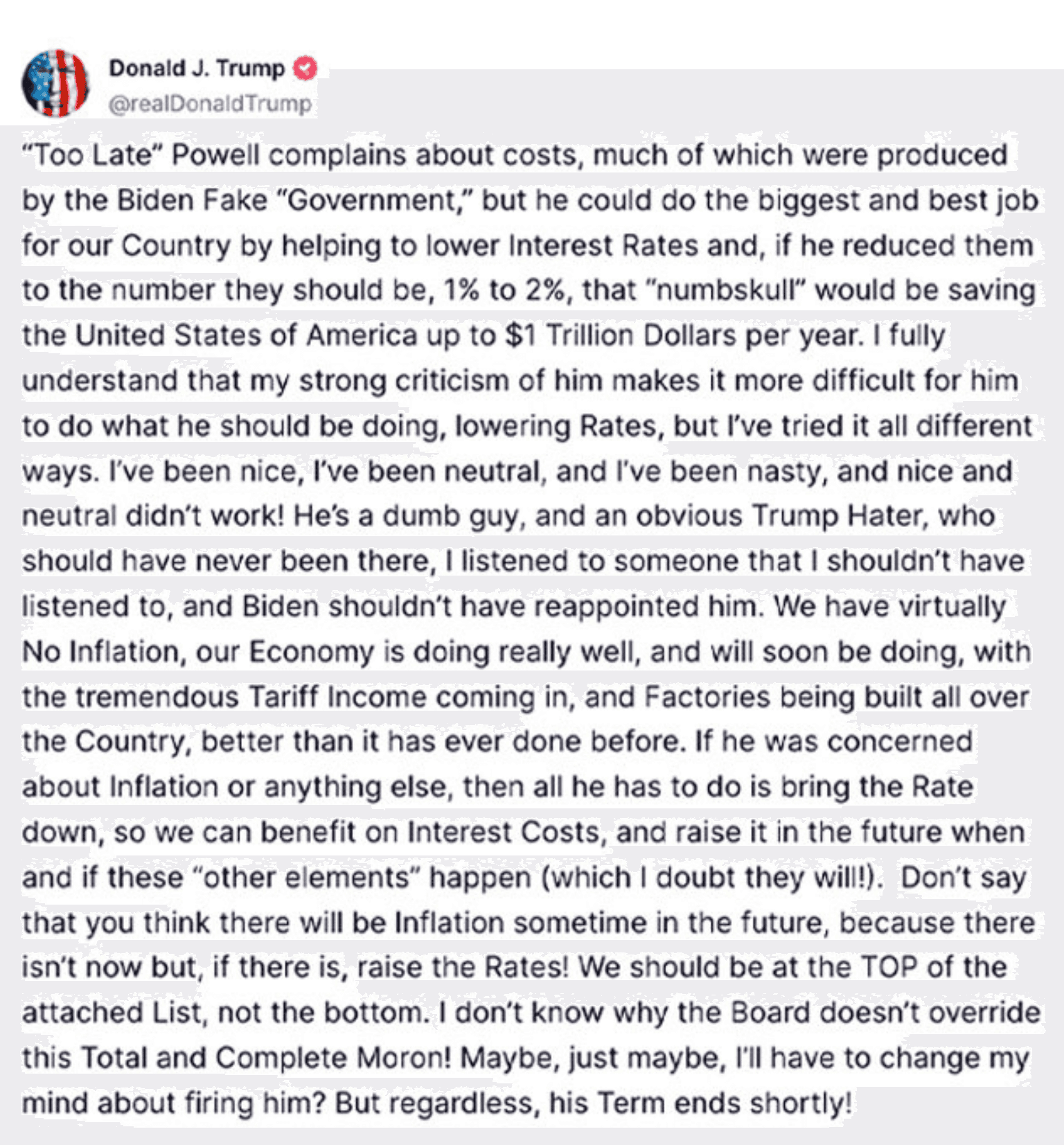 Right now, we’re seeing more of a “sell the rumor, buy the news” effect. Expectations were low, so when Powell was at least neutral in his report, holding off on saying anything negative, markets actually breathed a little sigh of relief. But if we go another few months without signs of rate cuts while the U.S. administration continues to call for his head, this could lead to some eventual unrest.