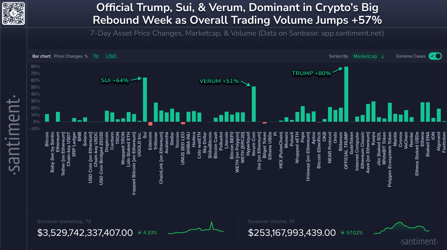 π In a week of major crypto gains, assets like $TRUMP (+80%), $SUI (+64%), & $VERUM (+51%) have enjoyed nice decouplings from the rest of the market. With trad