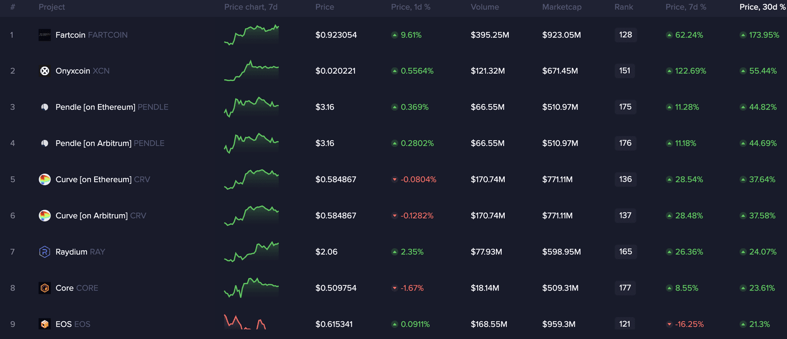Out of all coins above 500M marketcap, Fartcoin has the best 30d price performance, which indicates that the will to gamble didn't go away at all, even with all the macro FUD and crypto market slump.